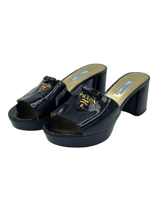 Prada Black Patent Saffiano Platform Logo Heels 7.5 M / 9 W