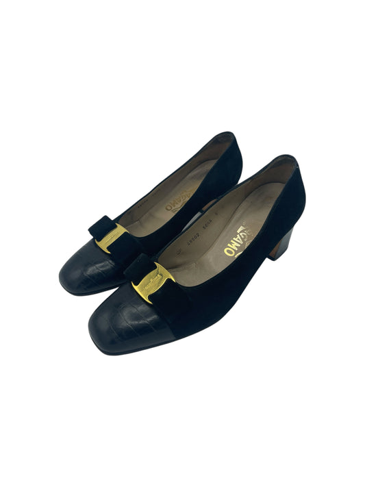 Salvatore Ferragamo Black Suede & Leather Double Bow Pumps 4.5 M / 6 W