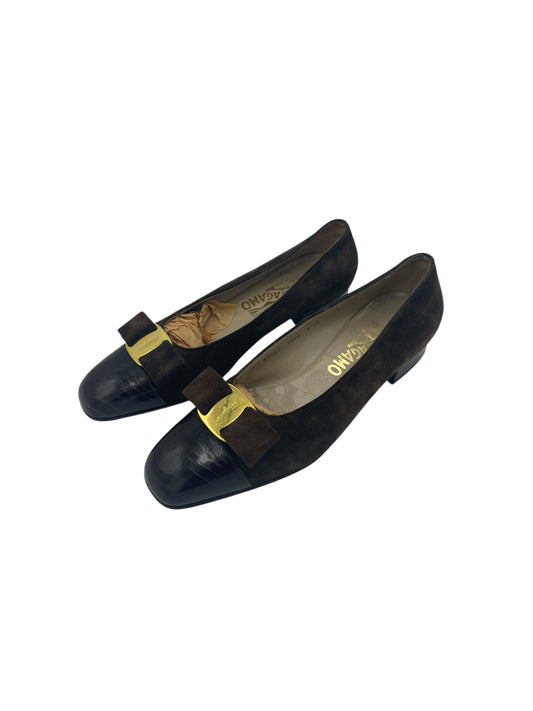 Salvatore Ferragamo Brown Suede & Leather Double Bow Pumps 4.5 M / 6 W