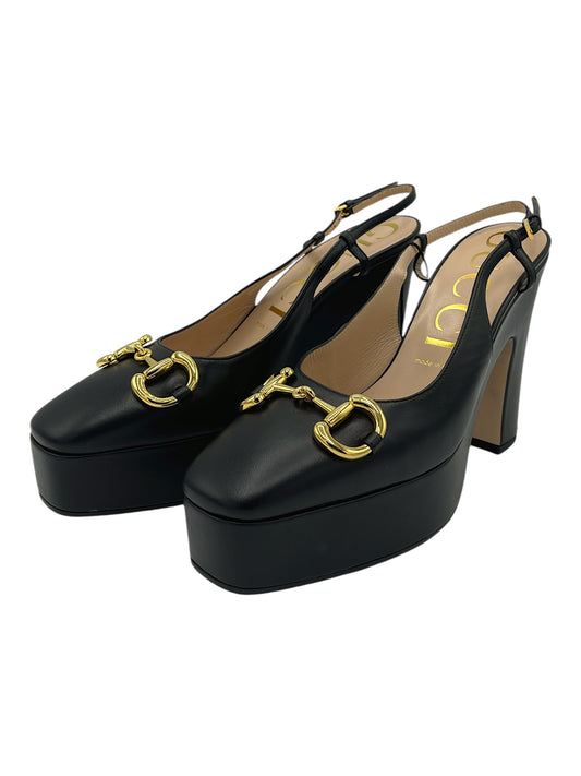 Gucci Black Leather Horsebit Platform Slingback Pumps 8 M / 9.5 W
