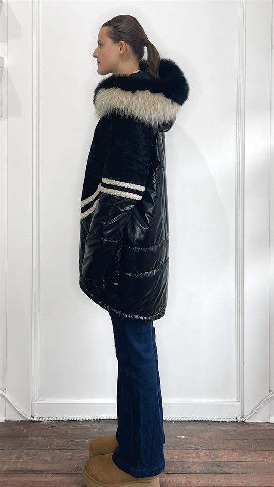 Mitchie's Black Shearling & Fox Fur Puffer Jacket Medium