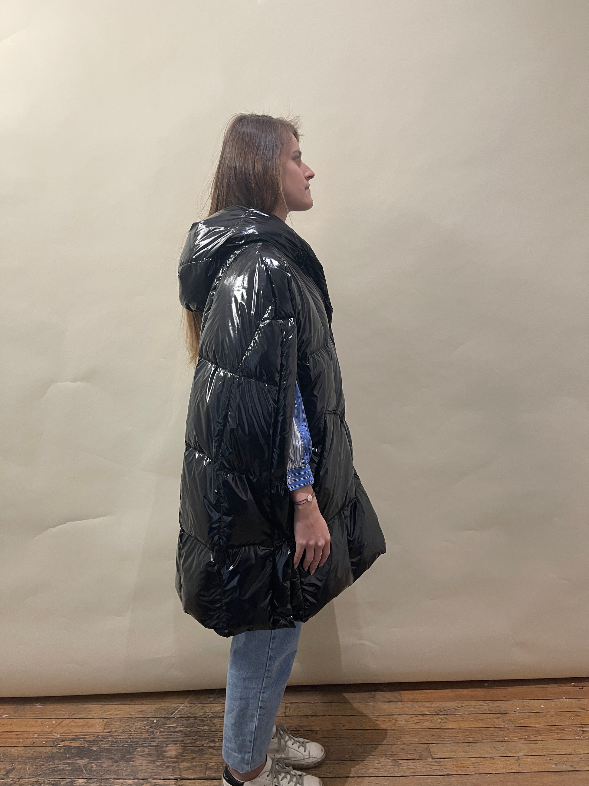 Annette Görtz Black Shiny Nylon Hooded Down Filled Puffer Poncho Medium - Made in Romania