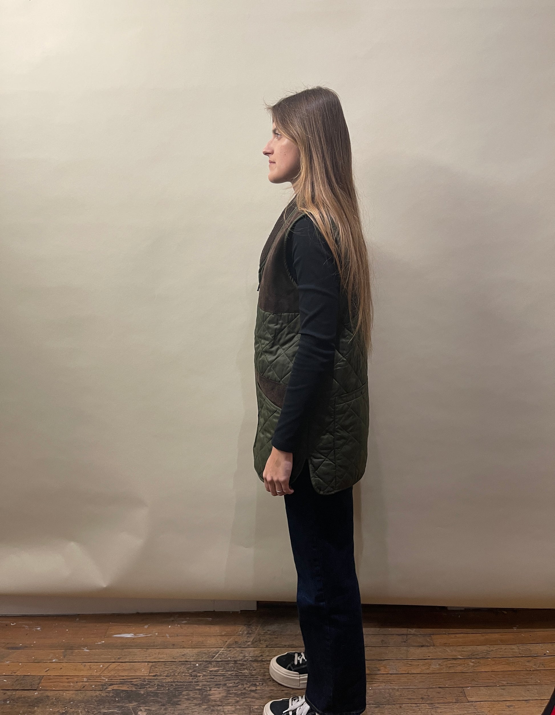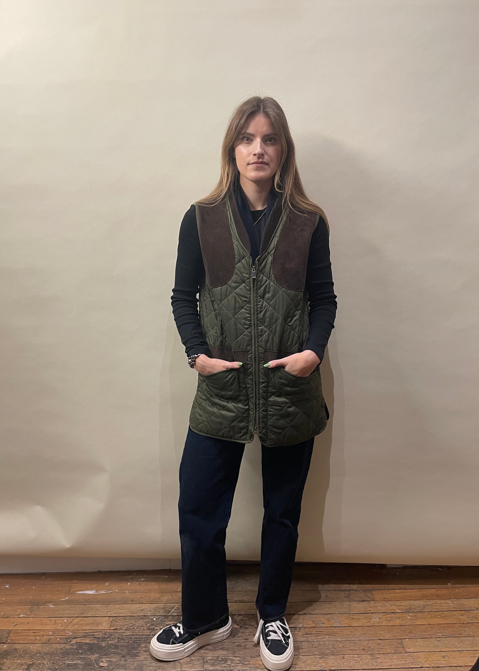 Barbour Olive Green & Brown Suede Patched New Keeper Wear Quilted Gilet Large