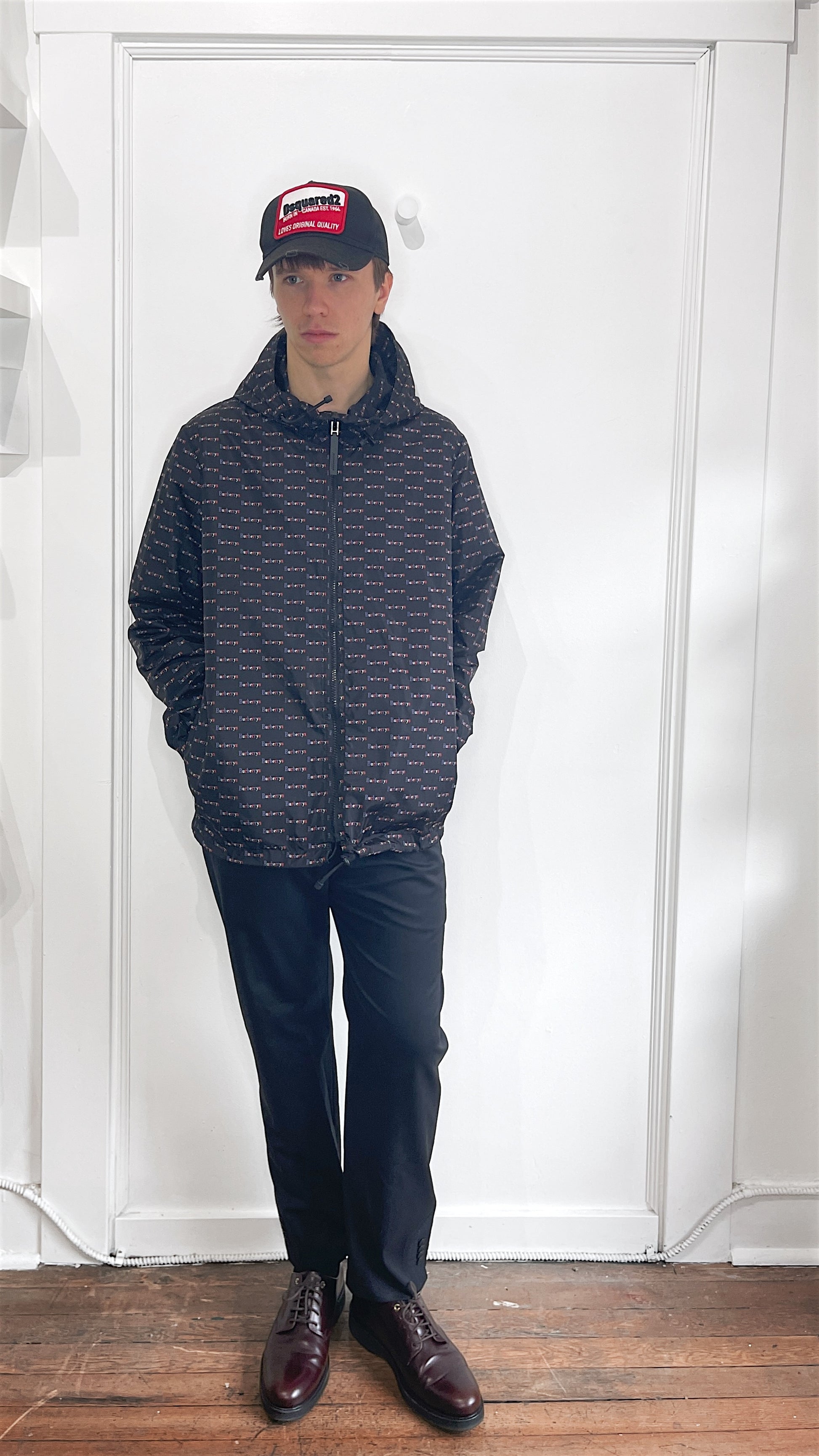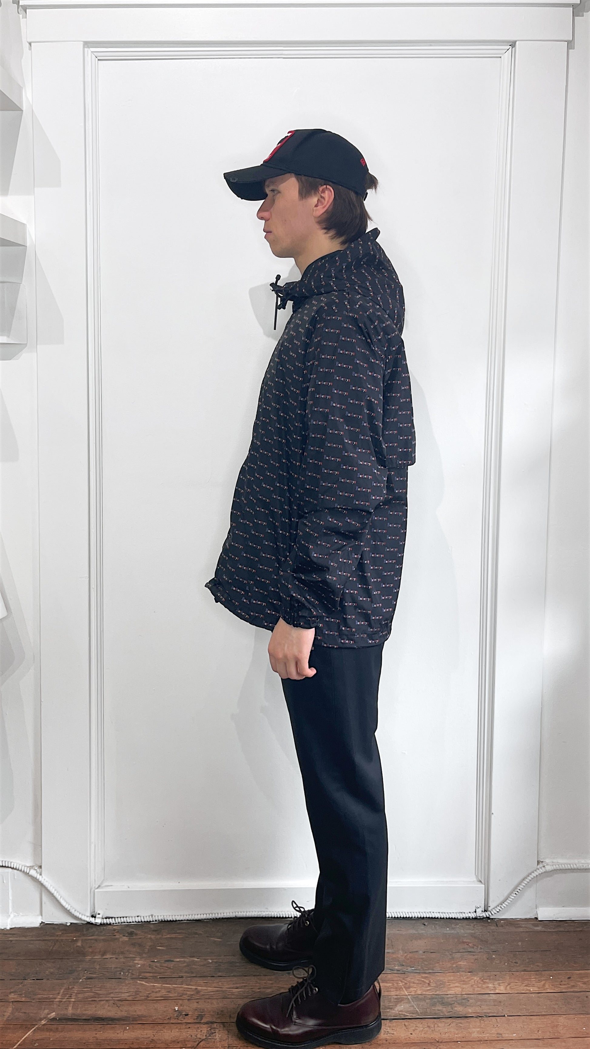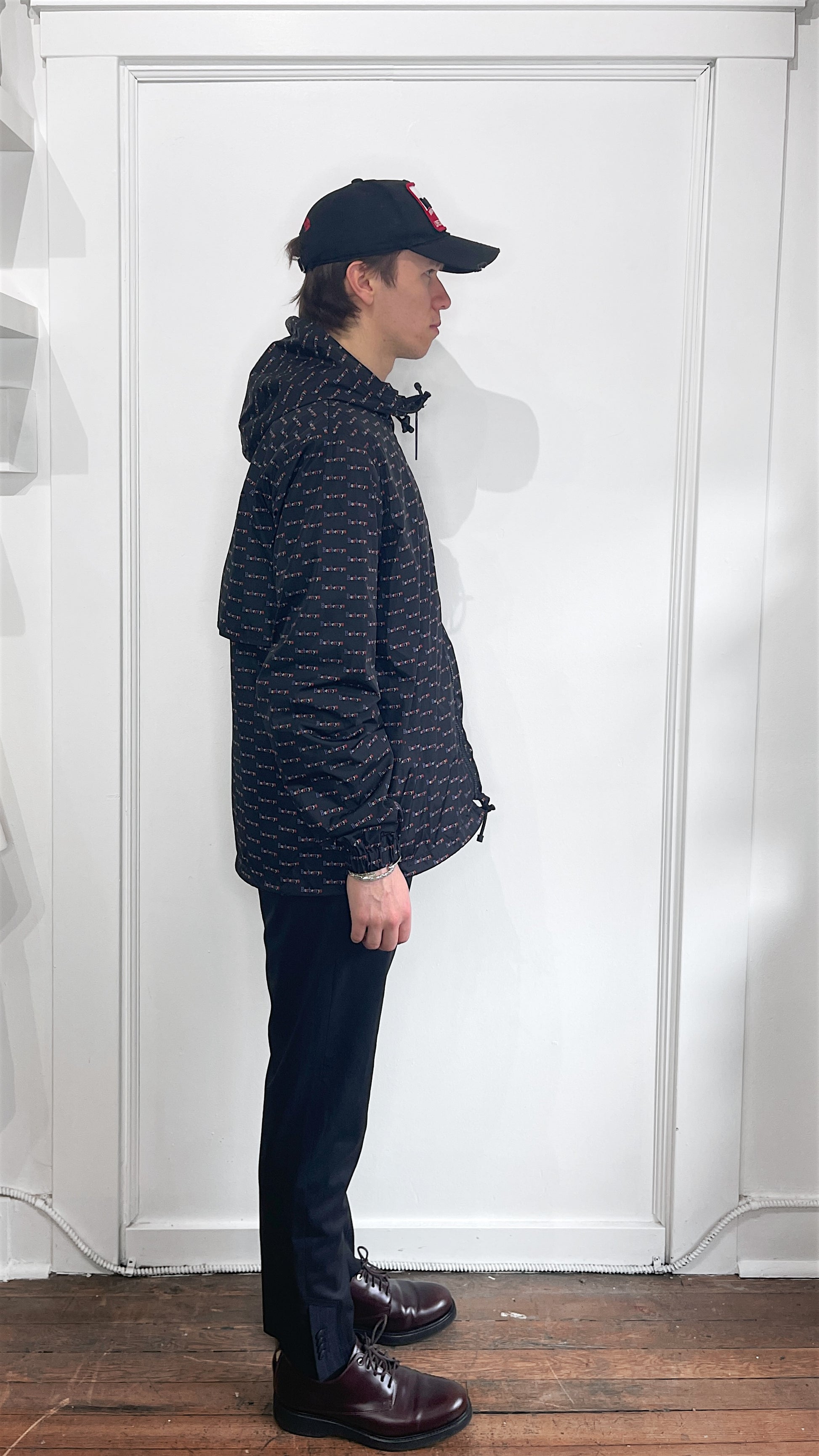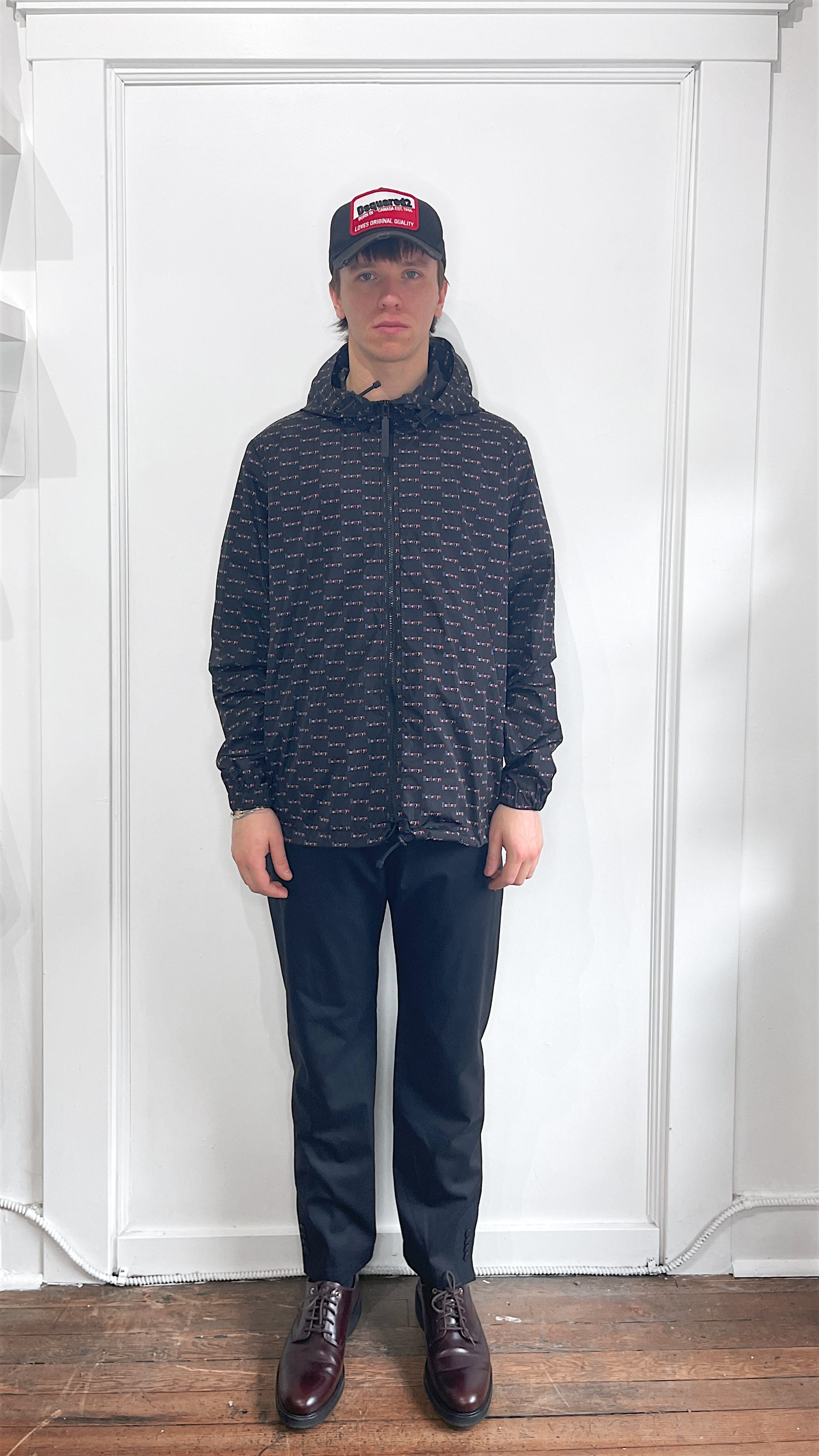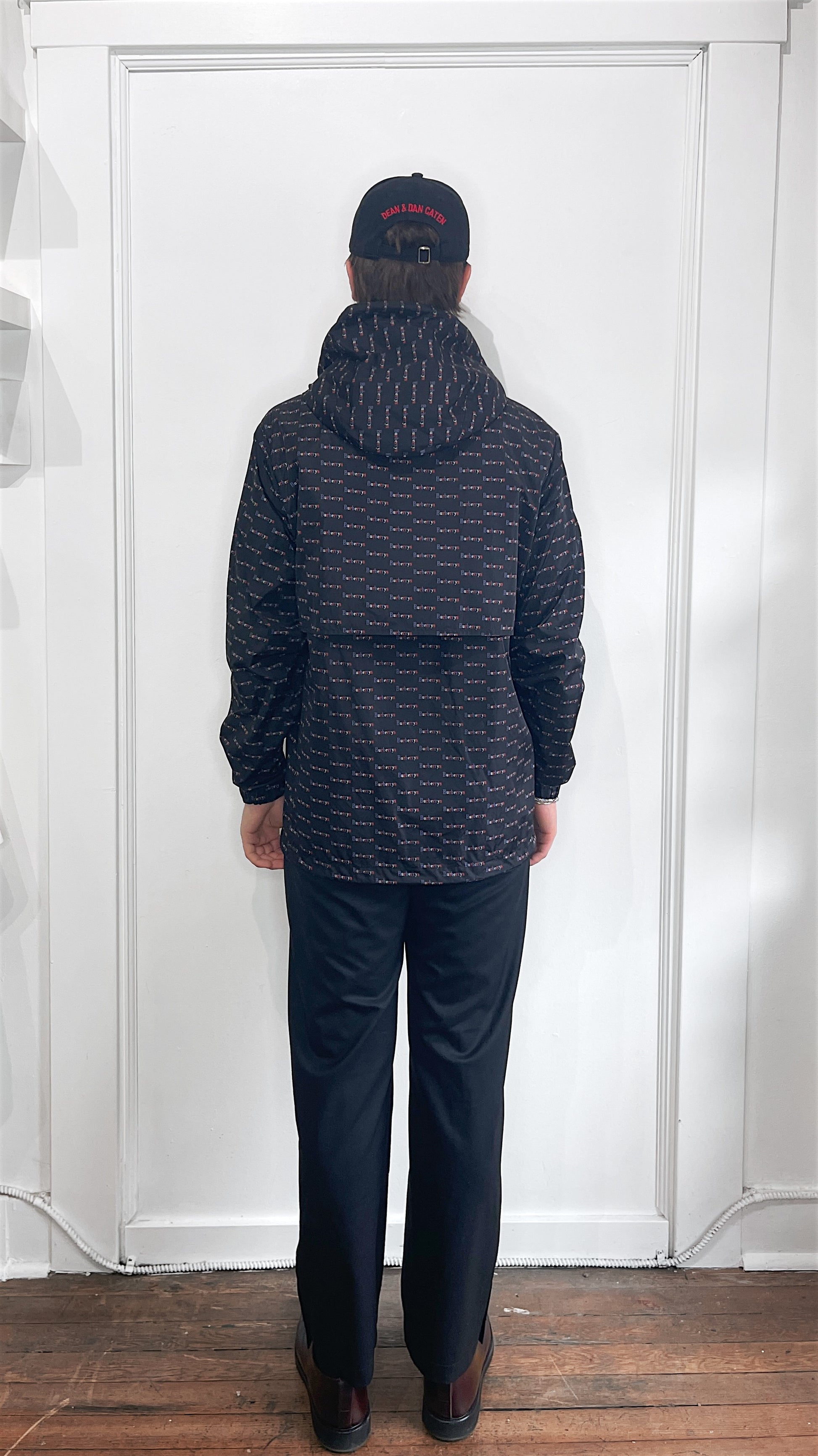 Item: Burberry London Black & Multicolour 'Burberrys' AOP Hooded Windbreaker US38