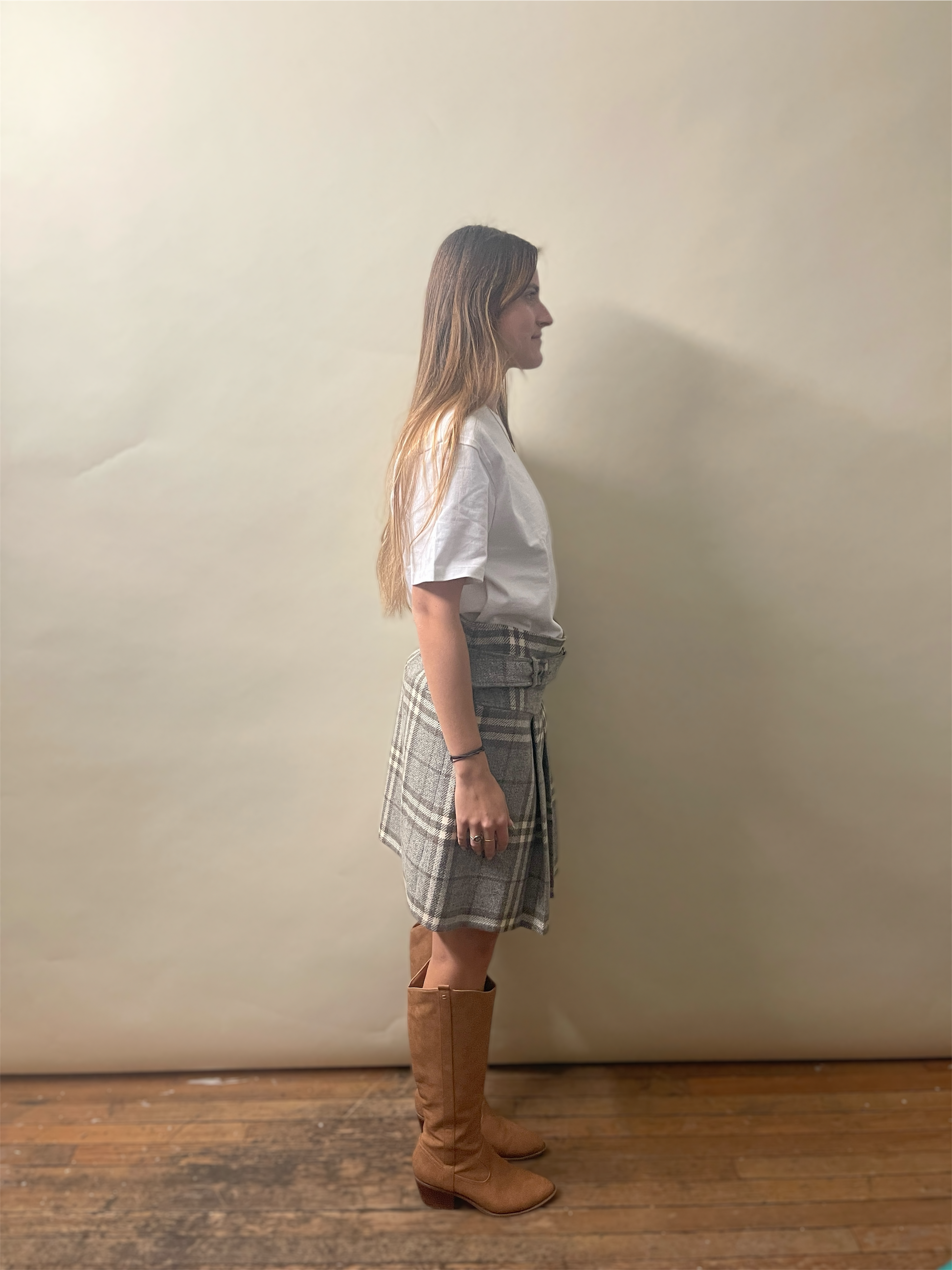 Burberry Light Grey & Taupe Plaid Lambswool Belted & Pleated Skirt 44 - Made in Italy