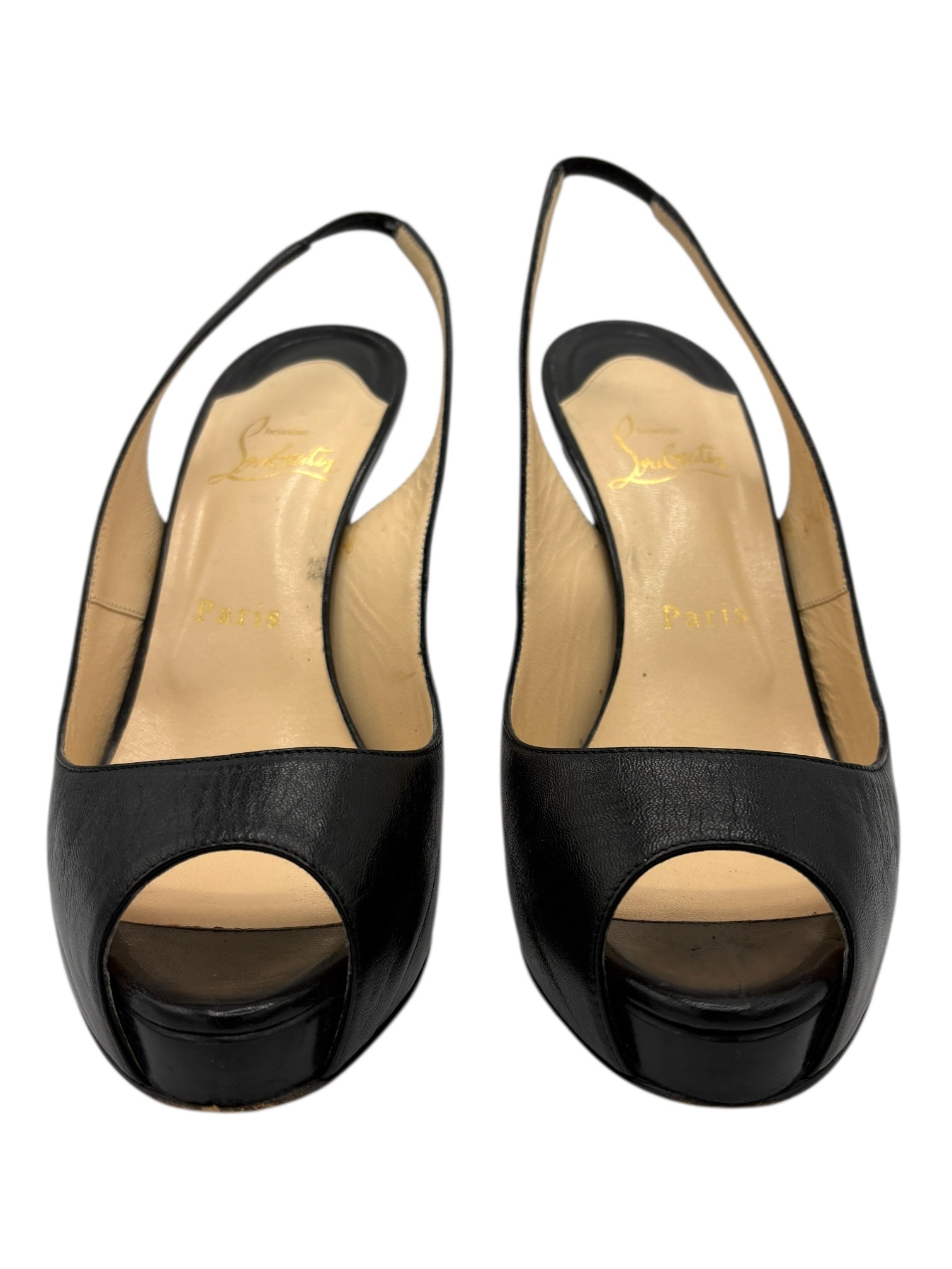 Item: Christian Louboutin Black Leather No Prive Peep Toe Slingback Wedge Pumps EU 38.5