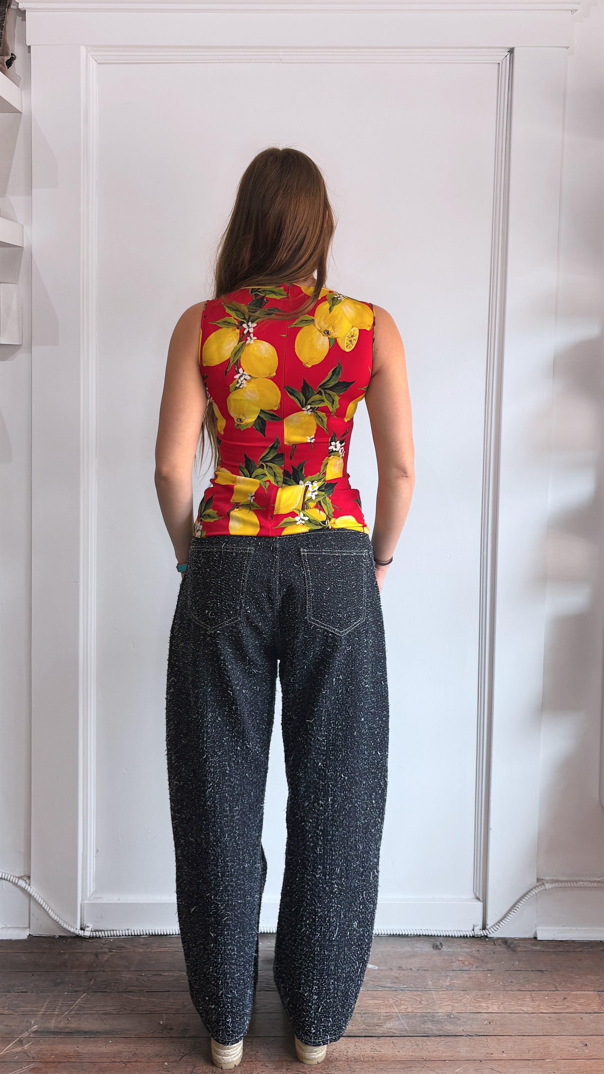 Item: Dolce & Gabbana Red & Yellow Lemon Pattern Silk Blend Sleeveless Shirt Medium