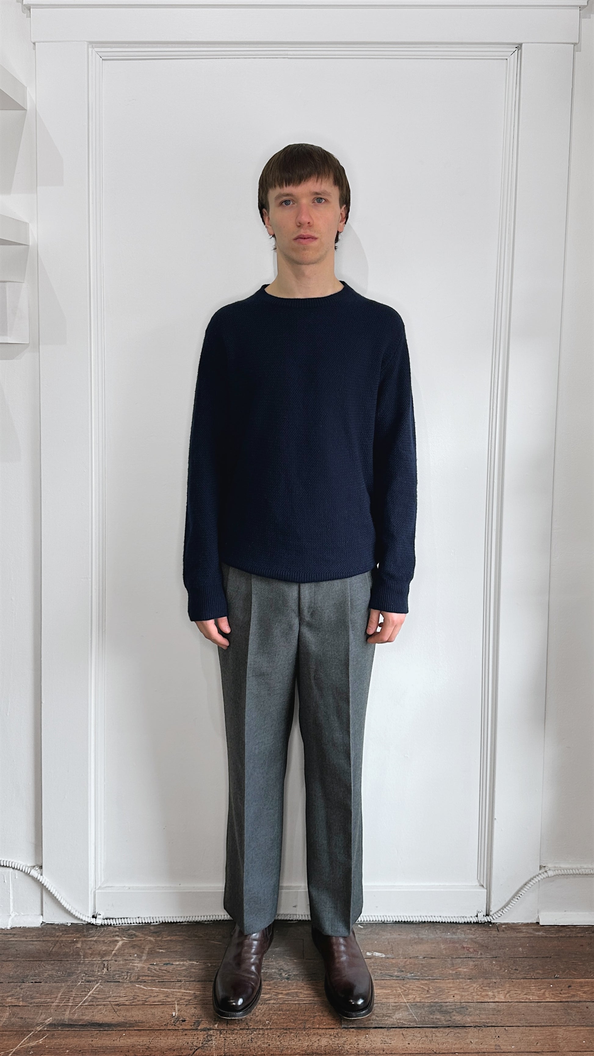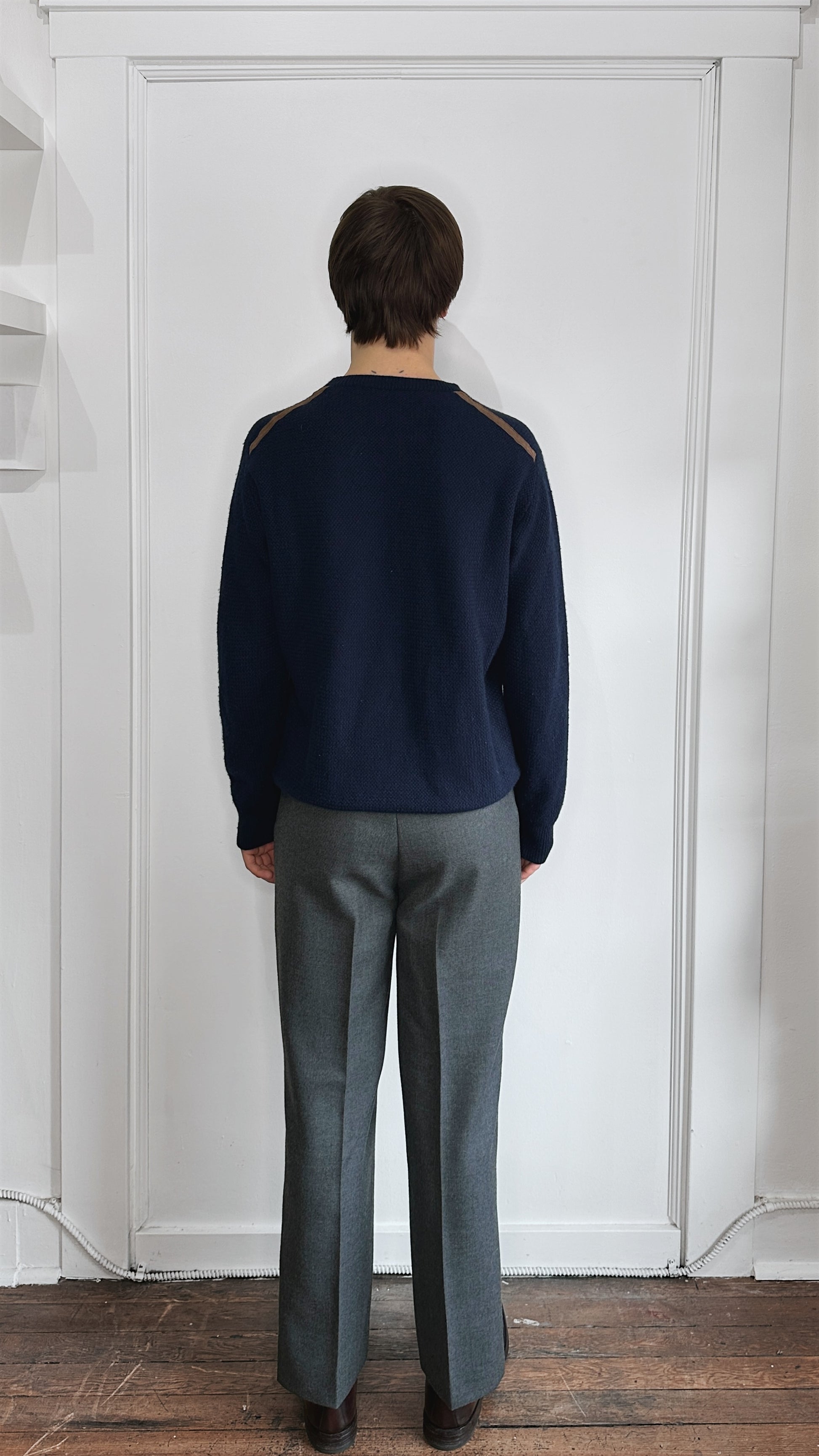 Item: Ermenegildo Zegna Navy Blue Pure Cashmere Knit Crewneck Sweater W/ Suede Shoulder Piping Extra Large 44