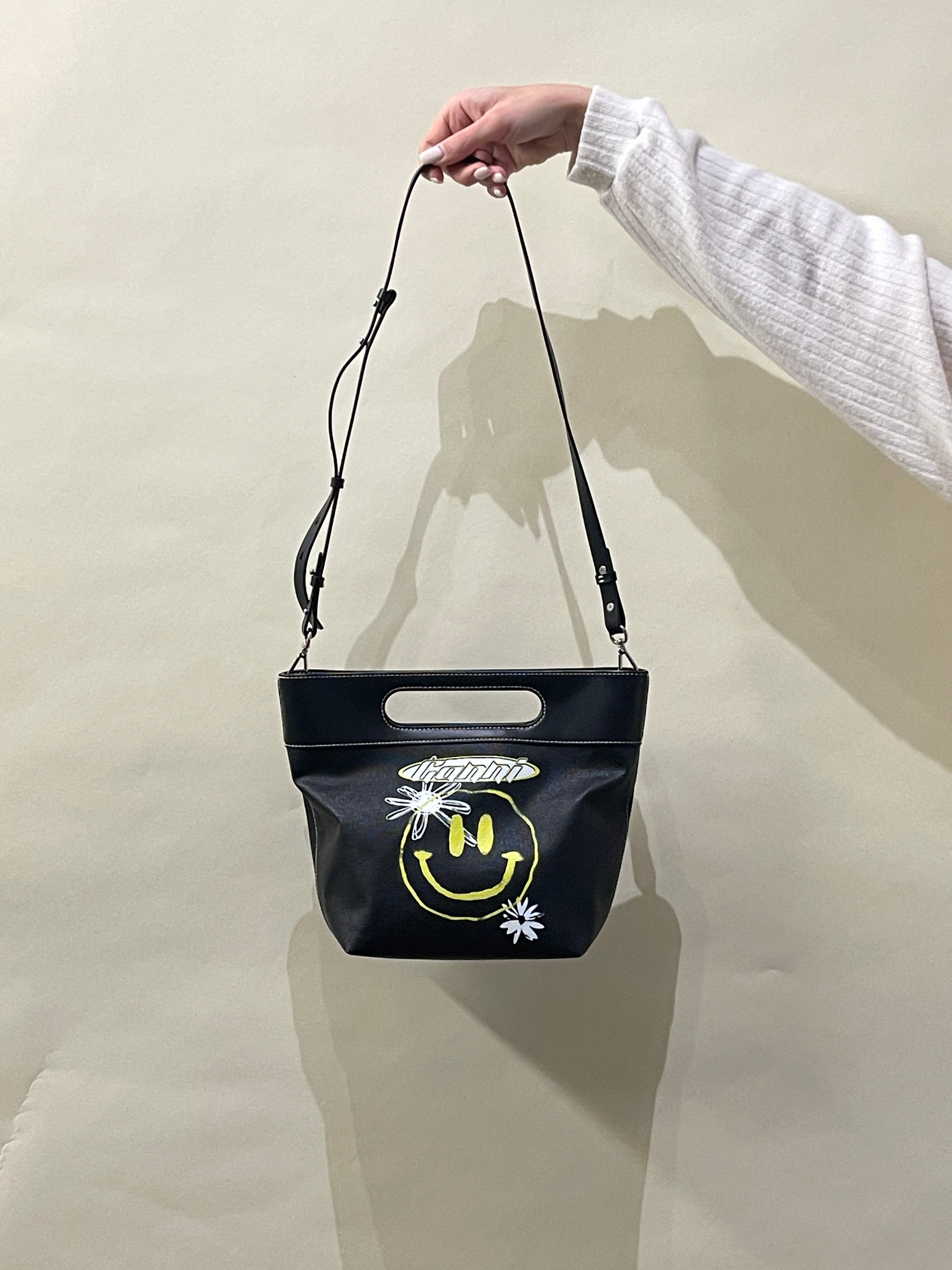 Ganni Black Canvas & Leather Smiley Motif Top Handle Bag OS - Made in China