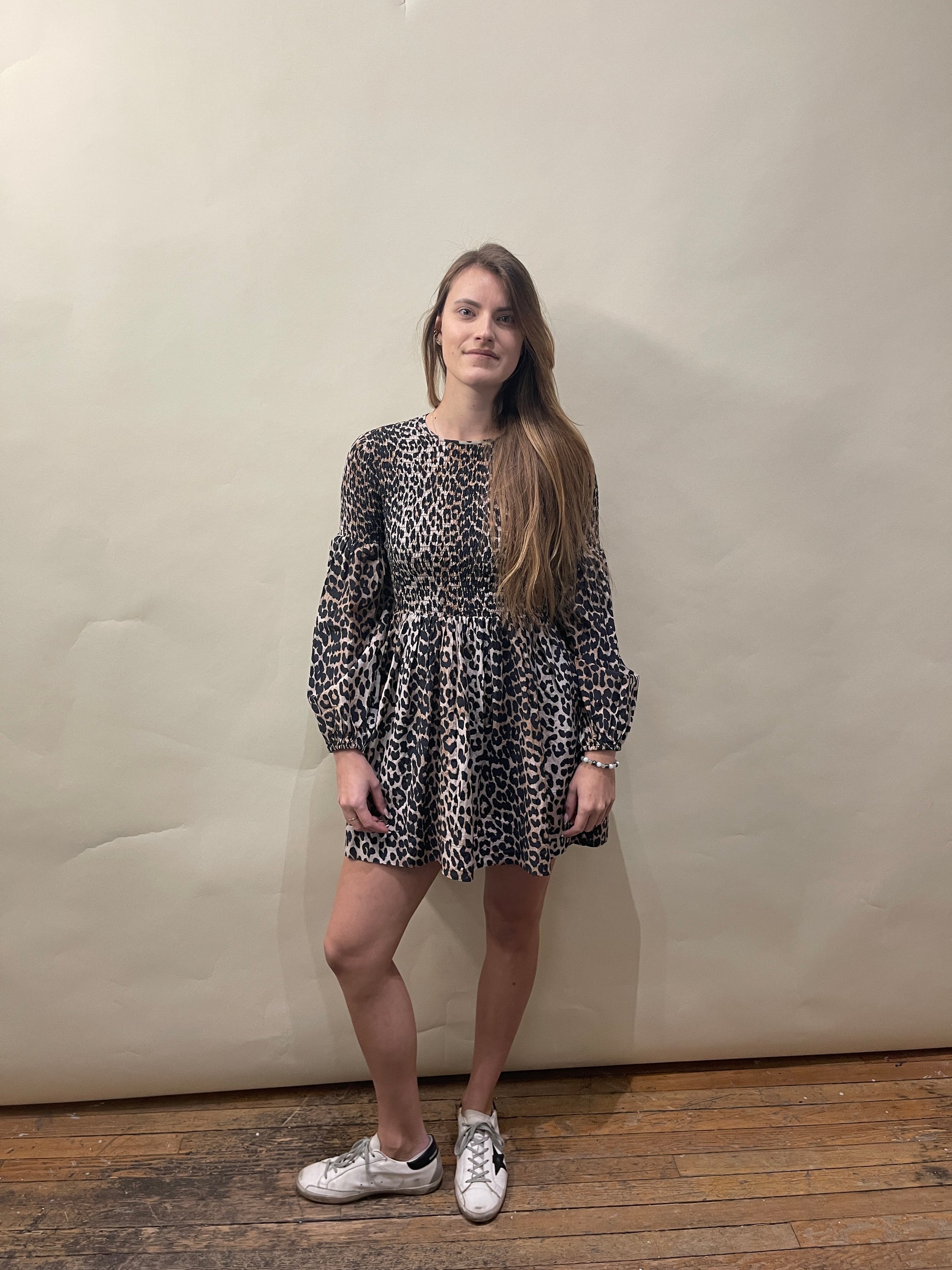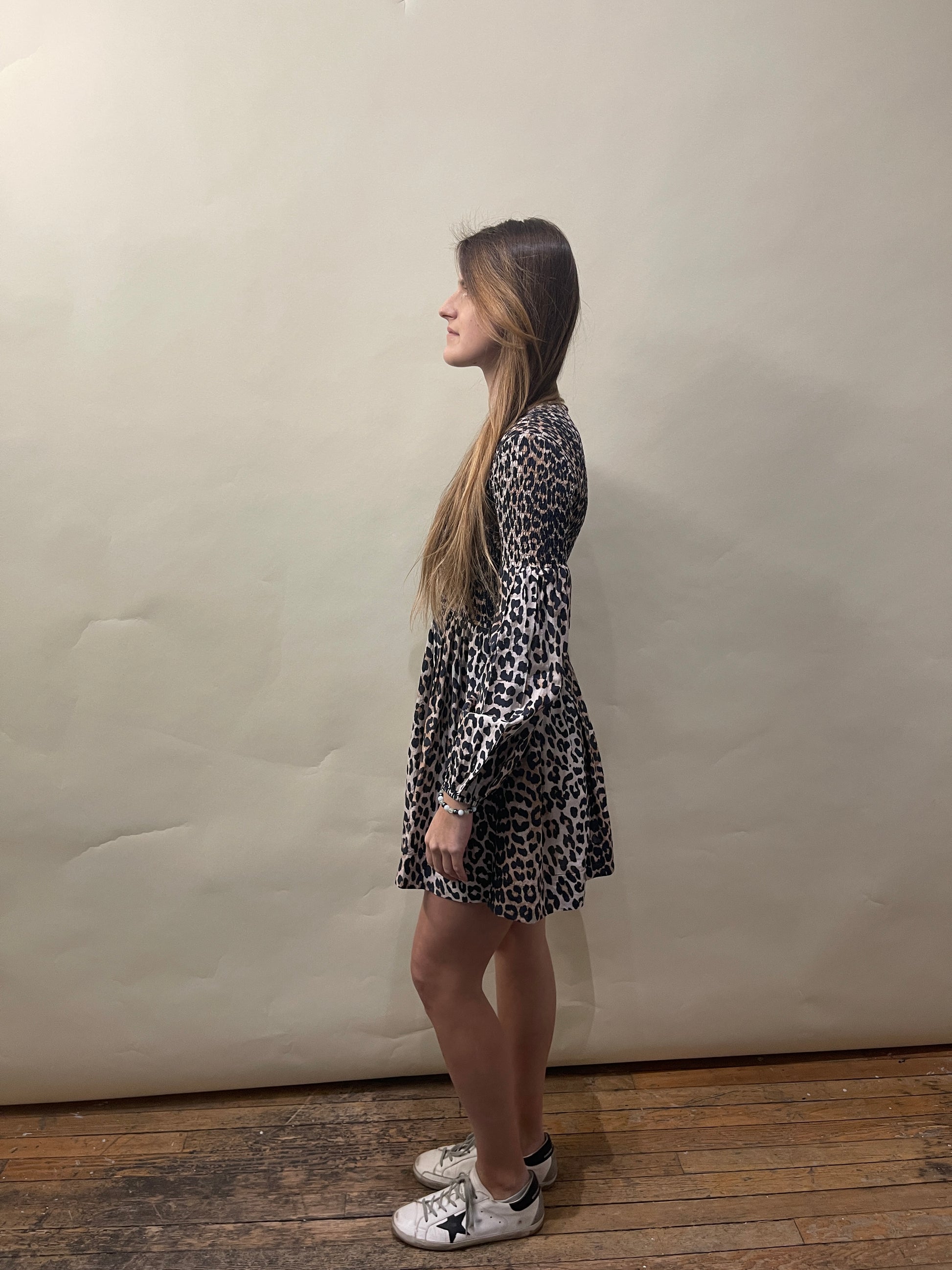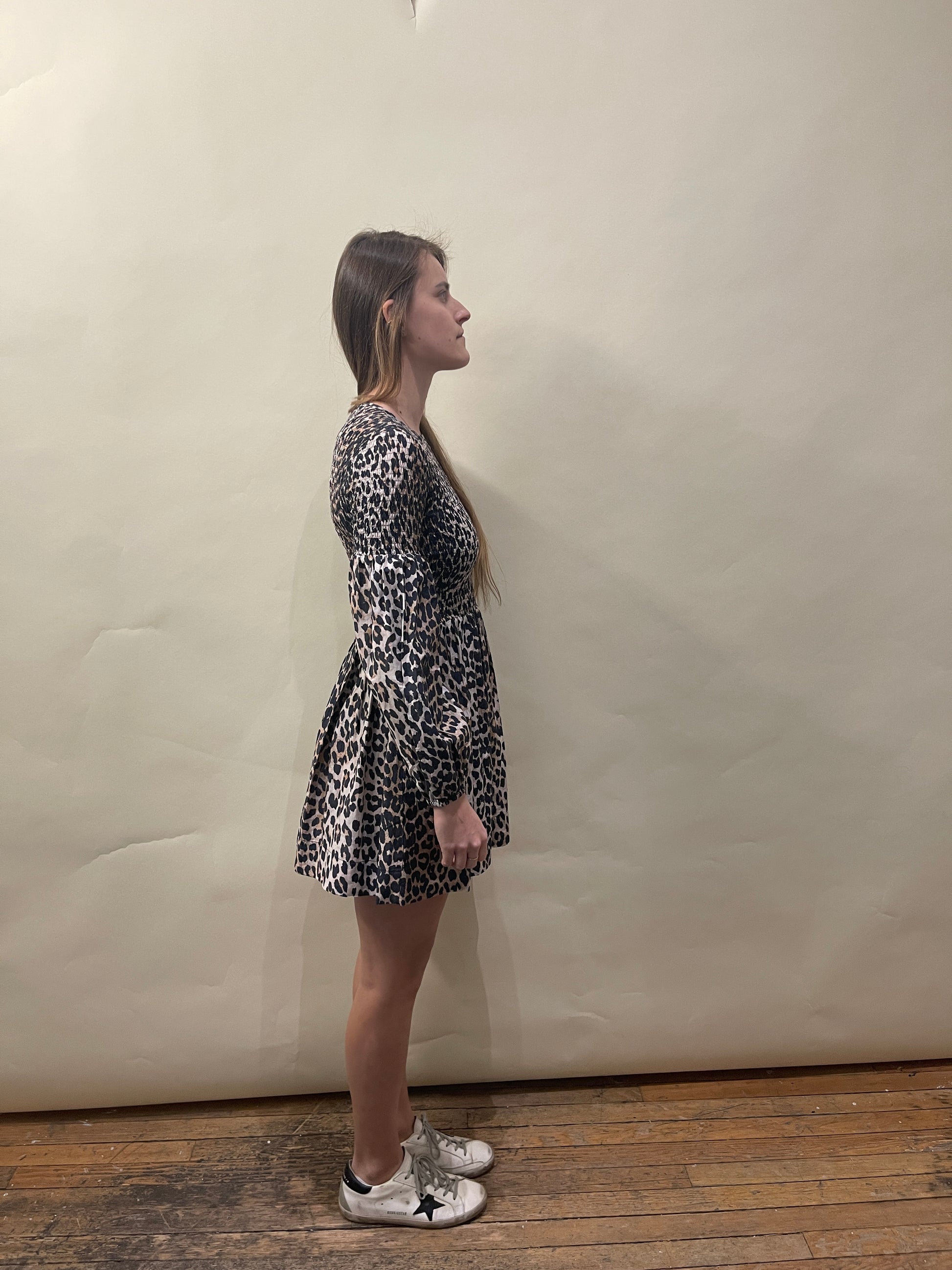 Ganni Leopard Print Cotton Silk Long Sleeve Midi Dress 34