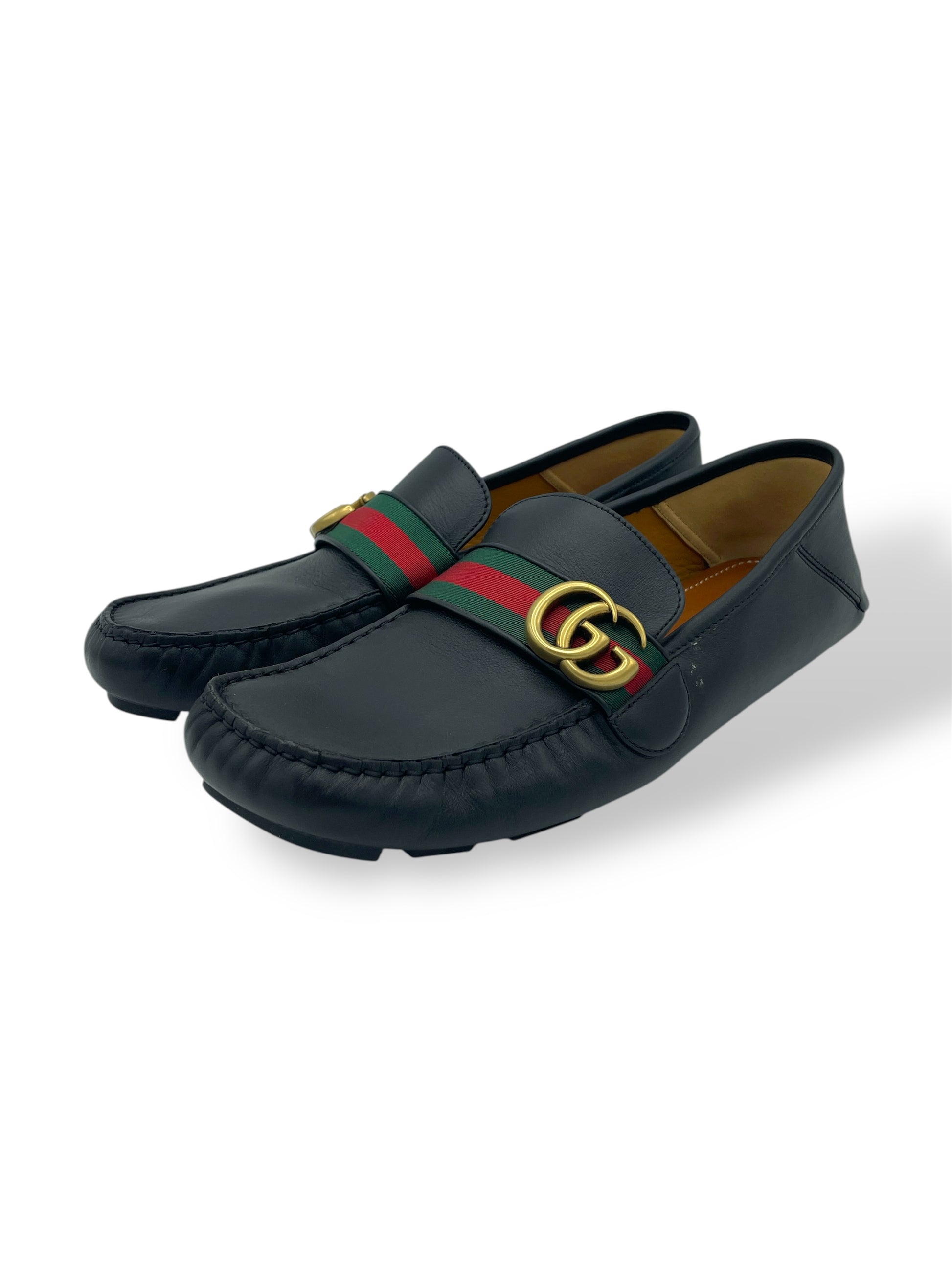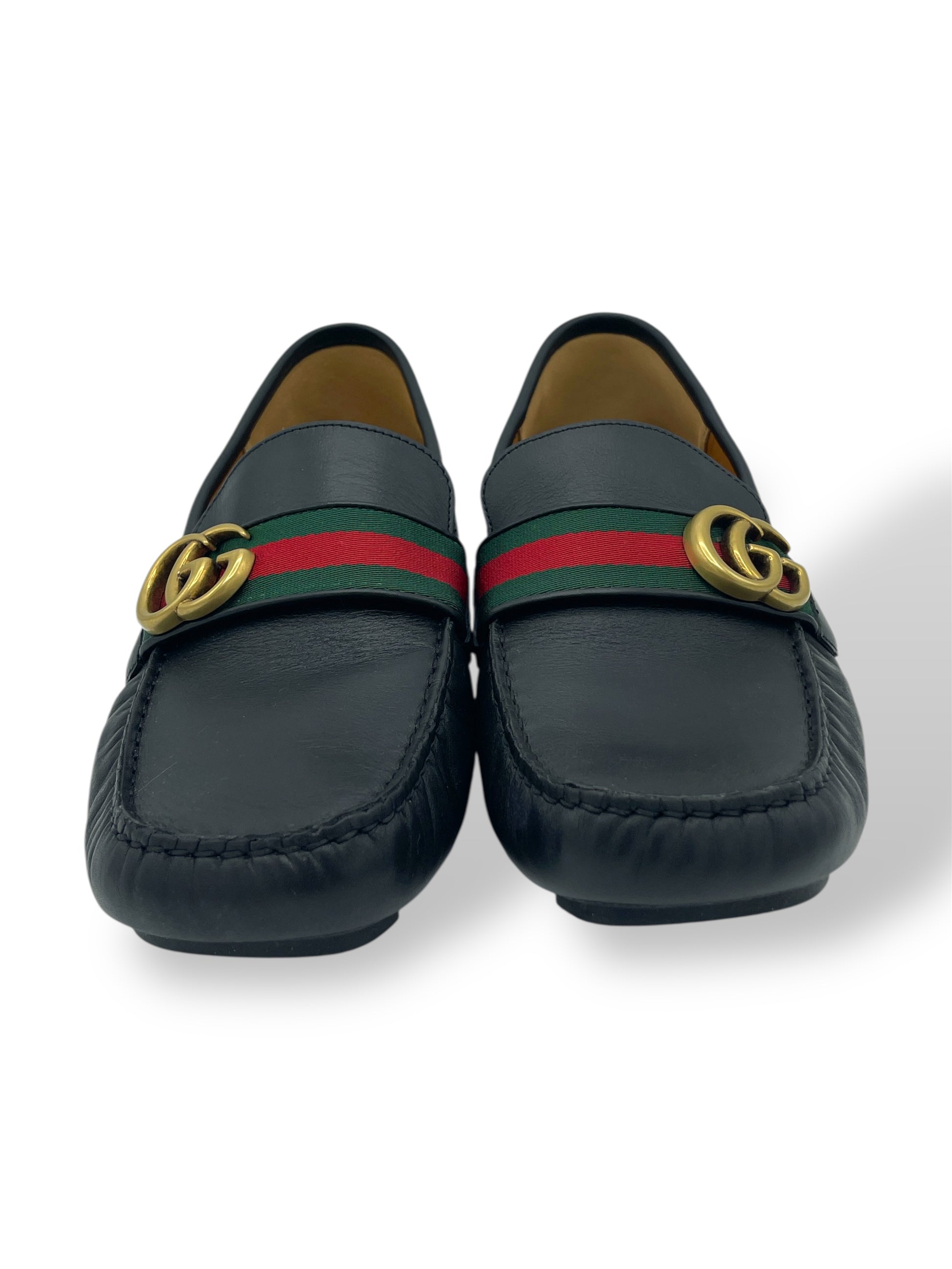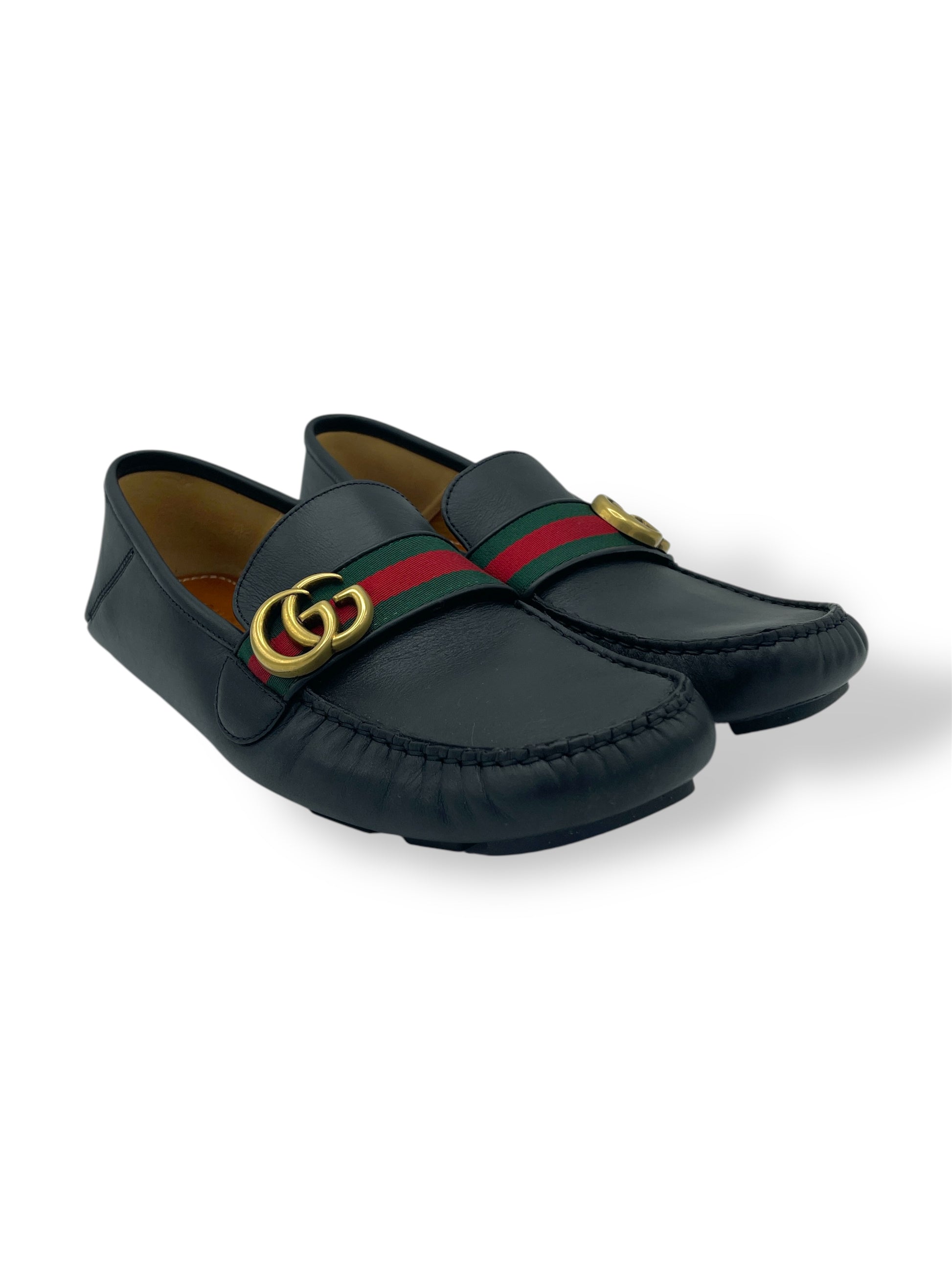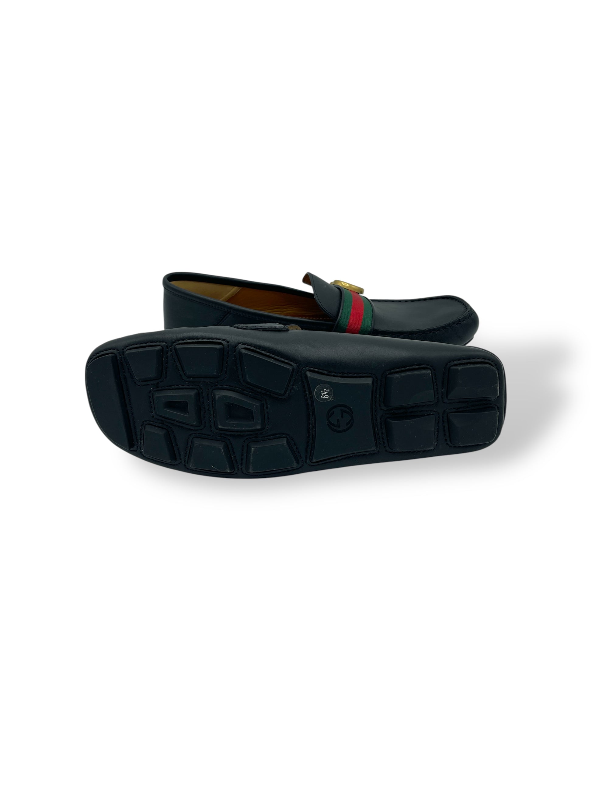 Gucci Black Leather Green & Red Stripe GG Logo Driving Loafers 8.5 M / 10 W - Made in Italy
