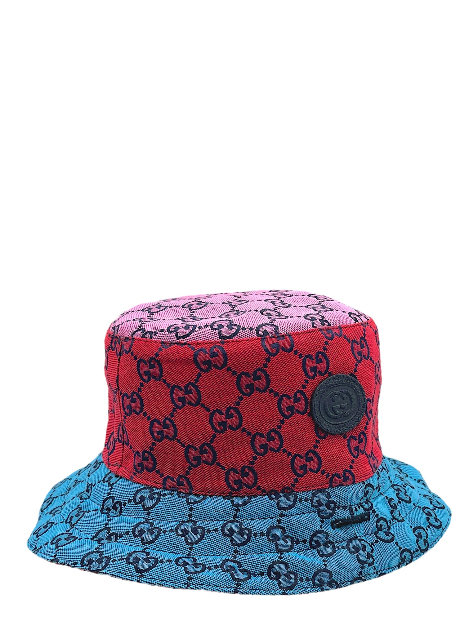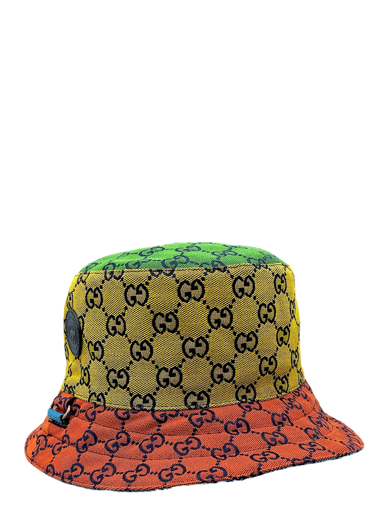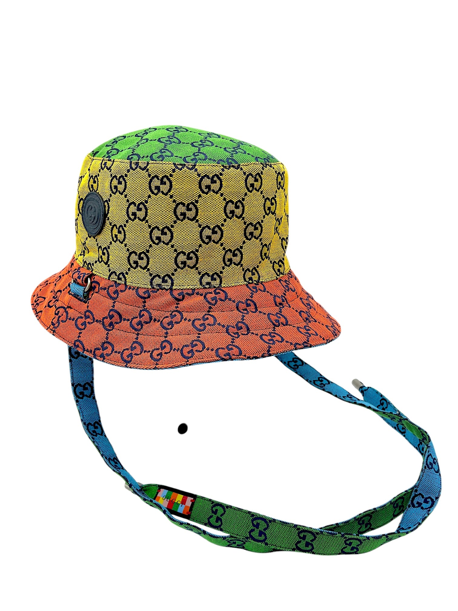 Item: Gucci Multicolour Reversible Monogram Heavy Cotton Bucket Hat W/ Calfskin Patch Logo & Strap.