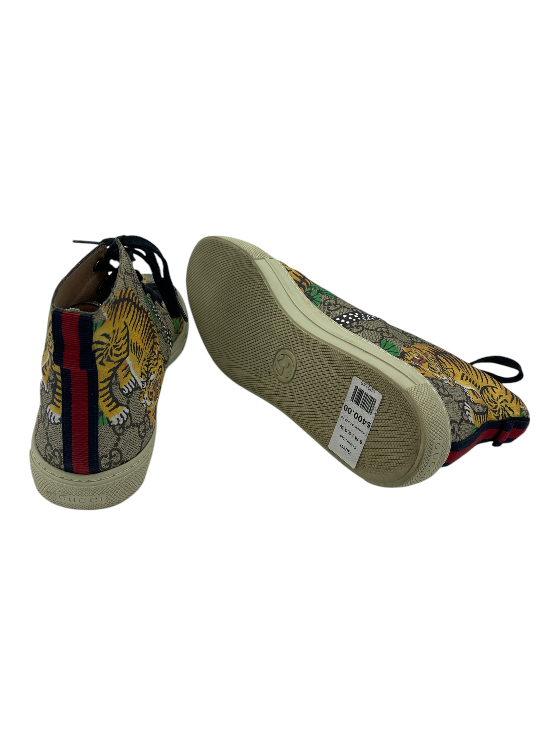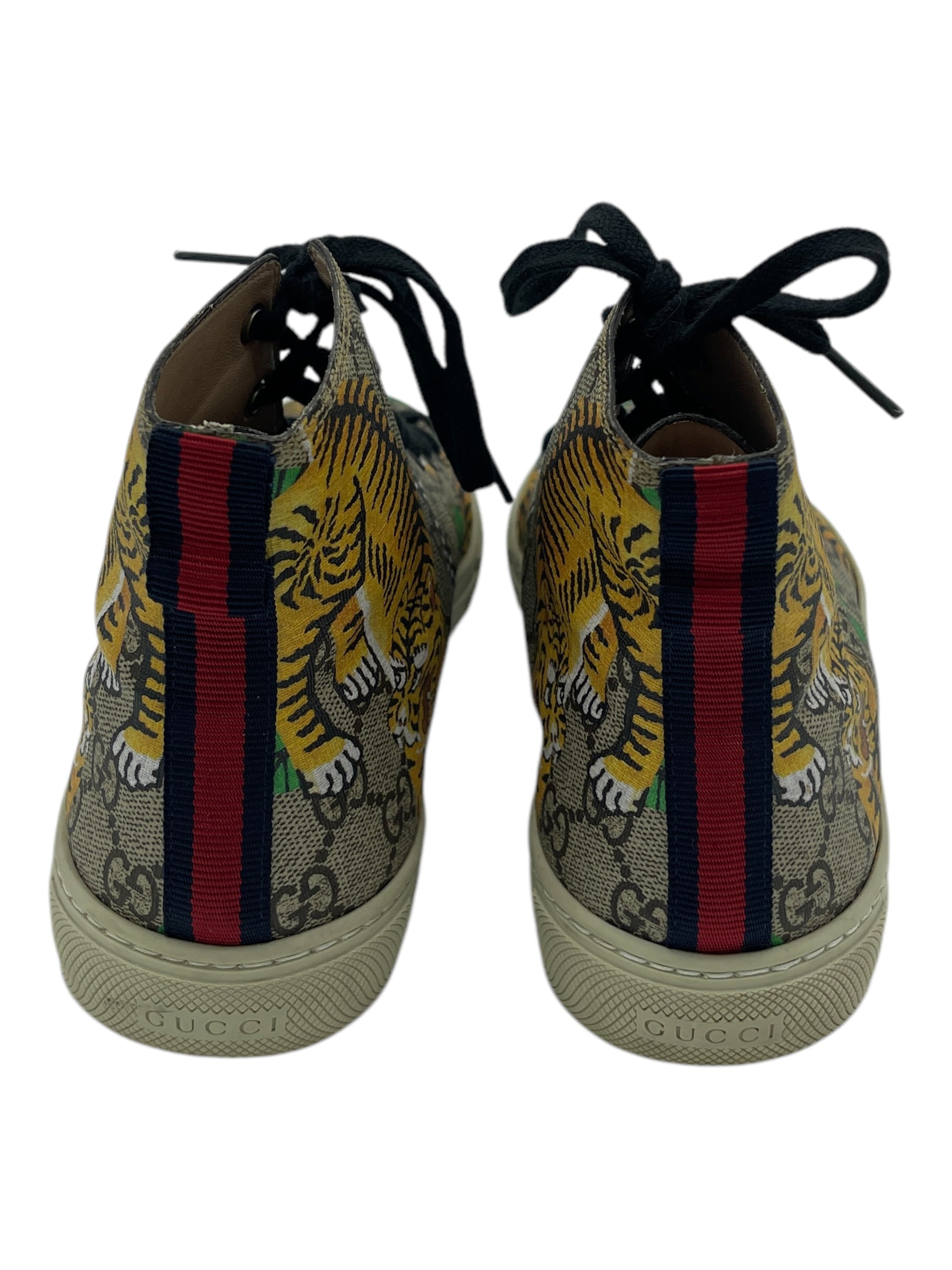 Item: Gucci Tan, Green, & Orange Coated Canvas Monogram Tiger Print Sneakers W/ Navy & Red Pull Tab 8 US - Made in Italy