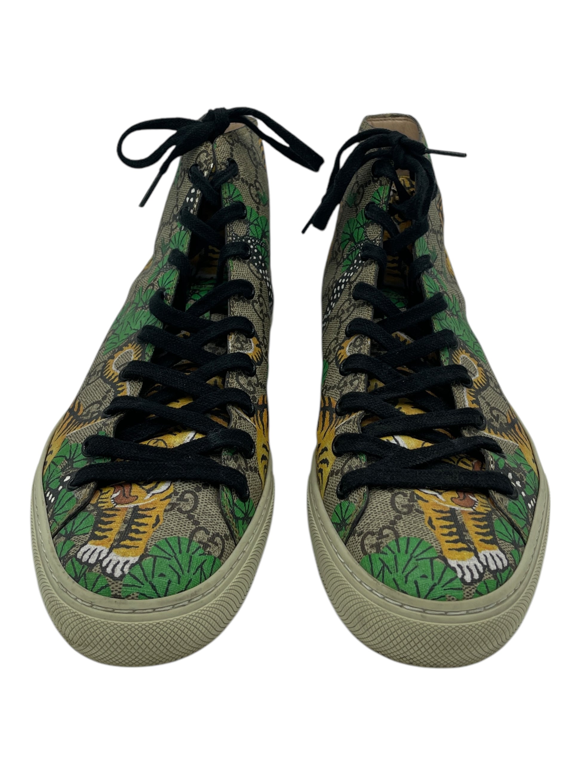 Gucci Tan, Green & Orange Monogram Tiger Print Coated Canvas High Top Sneakers 8 M / 9.5 W