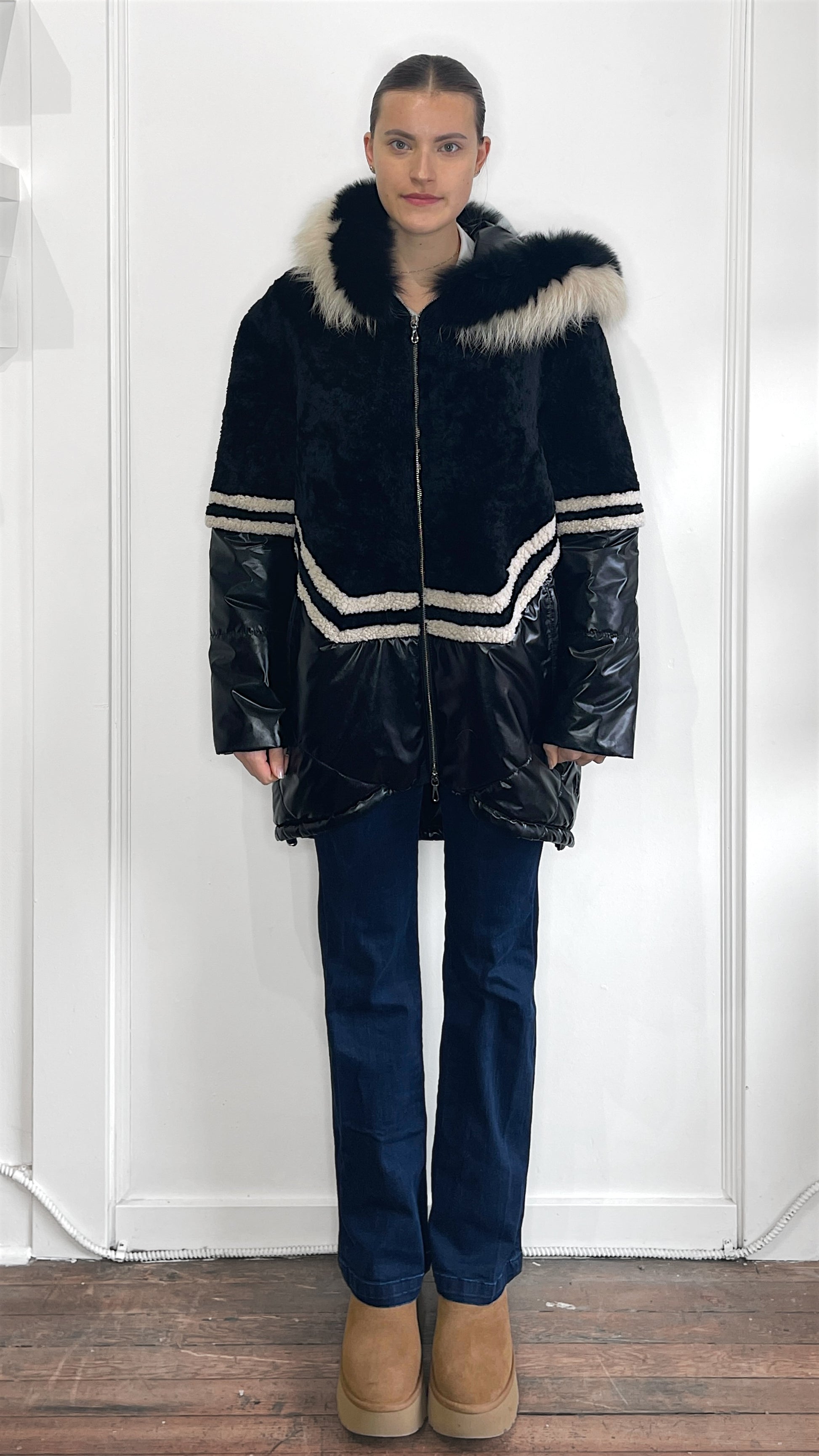 Item: Mitchie's Black Shearling & Polyester Mixed Puffer Jacket W/ Fox Fur Hood Medium