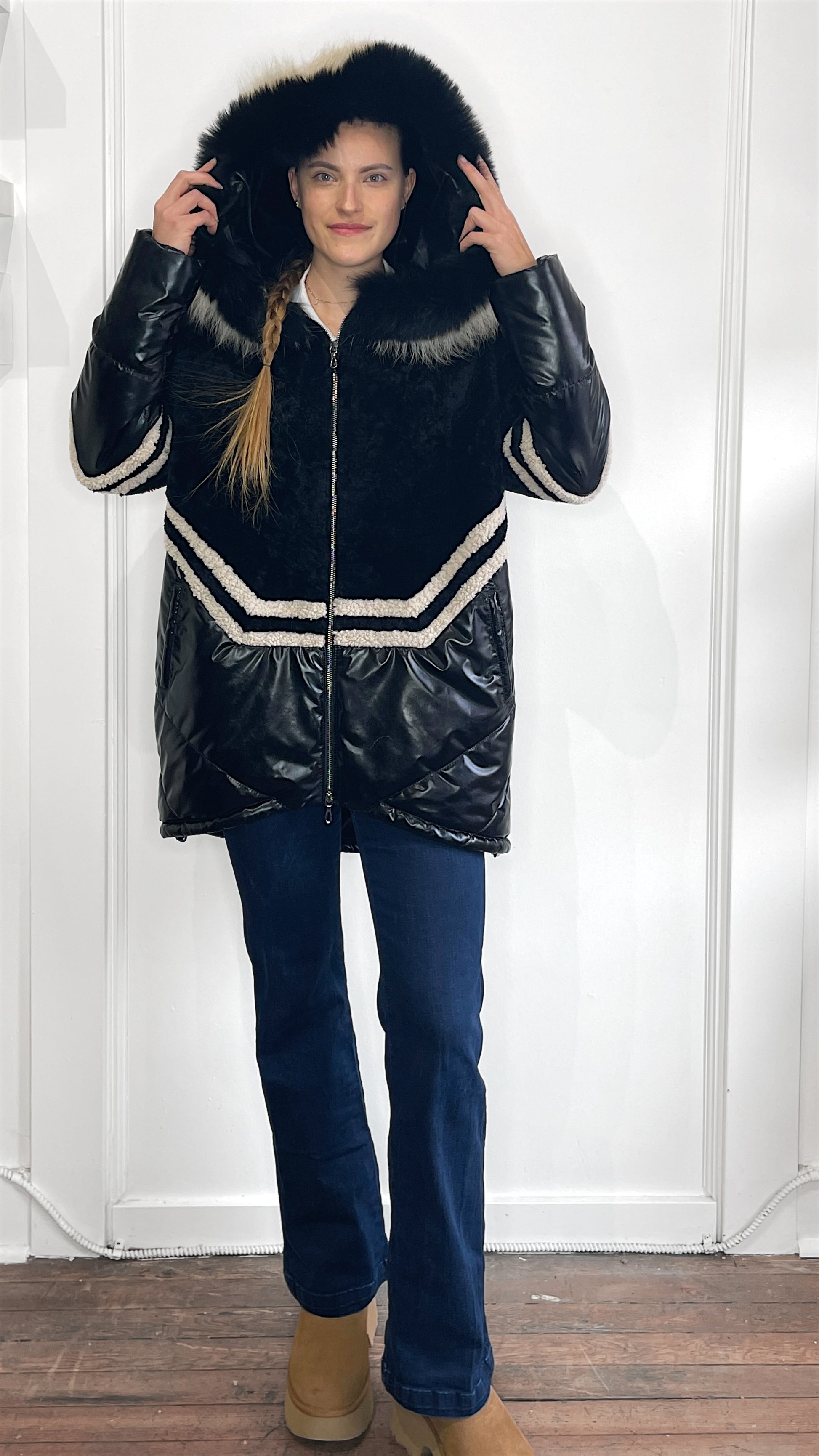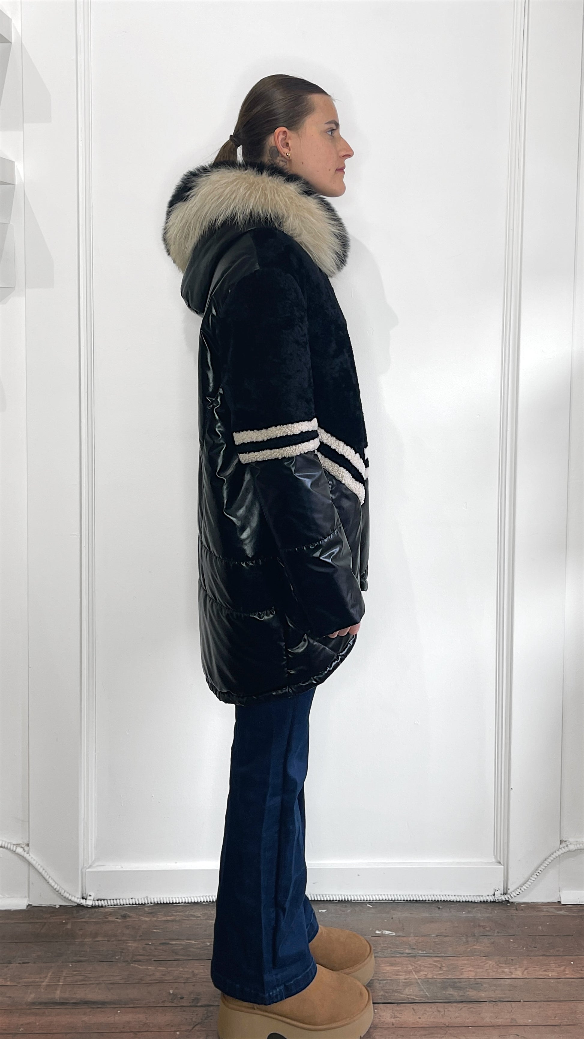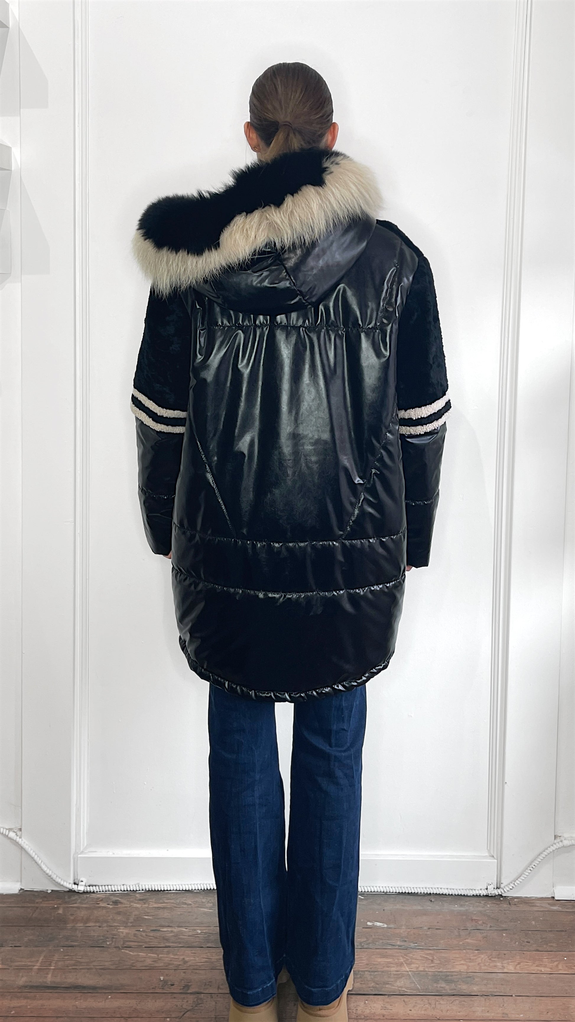 Mitchie's Black Shearling & Fox Fur Puffer Jacket Medium