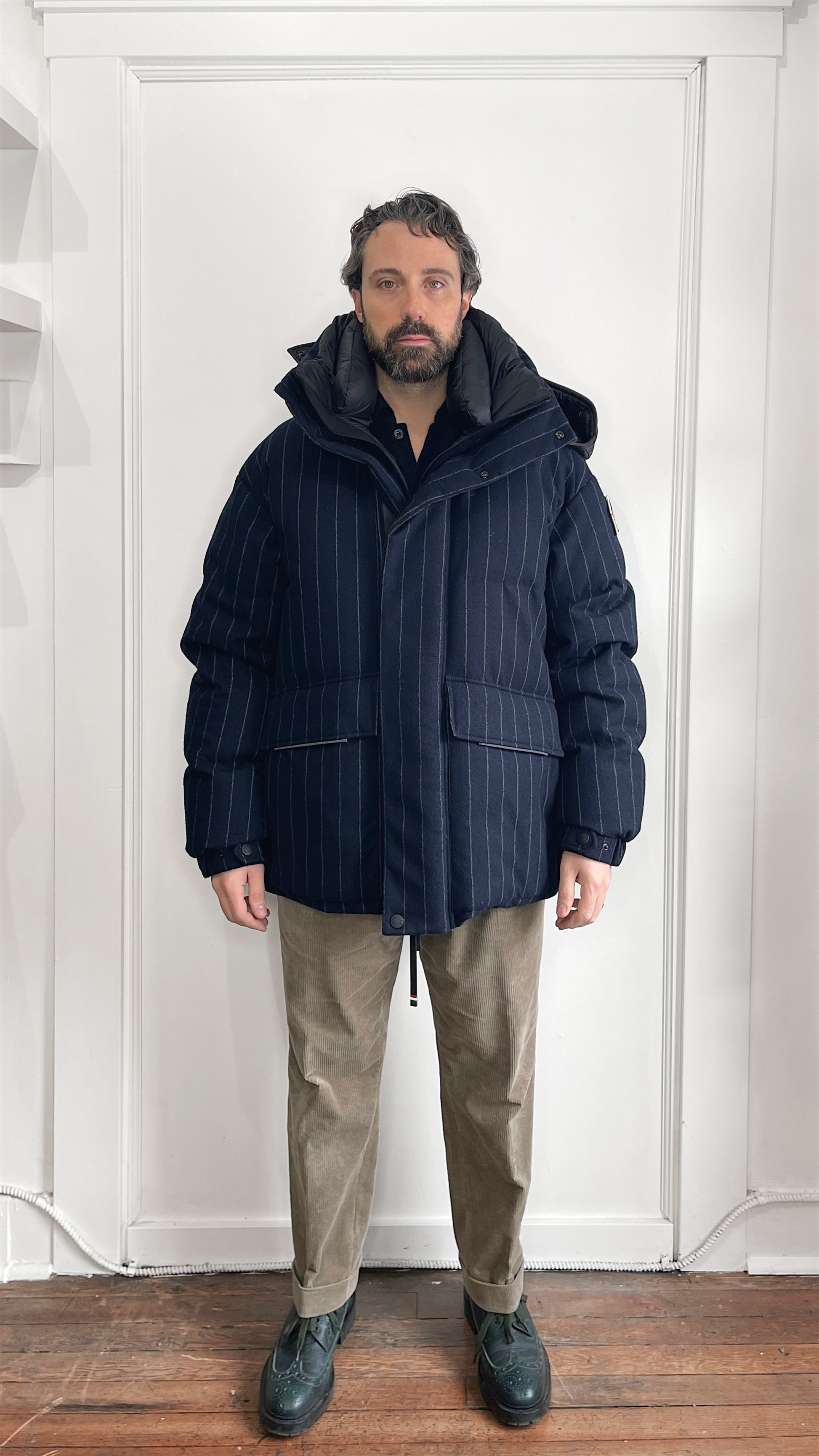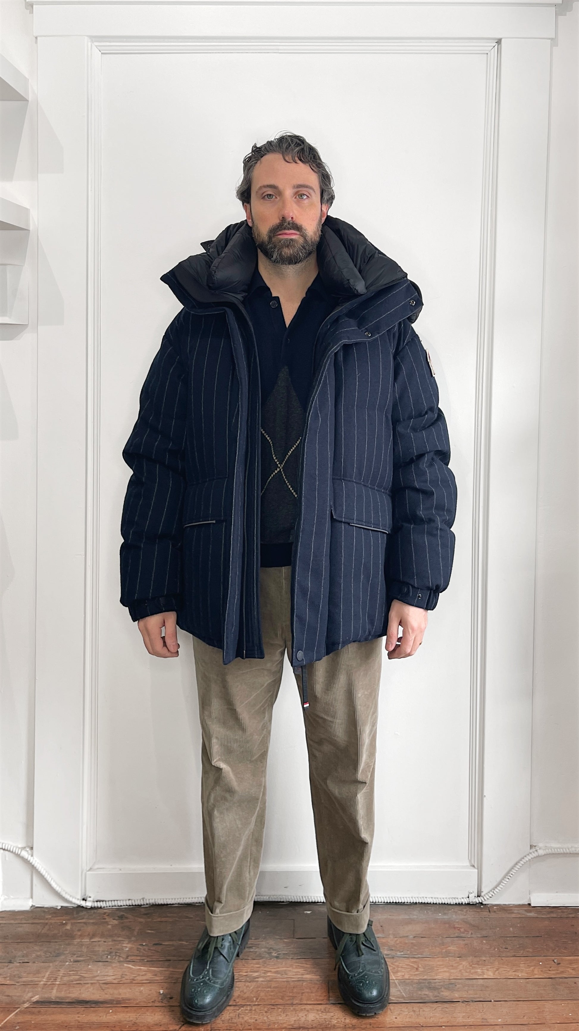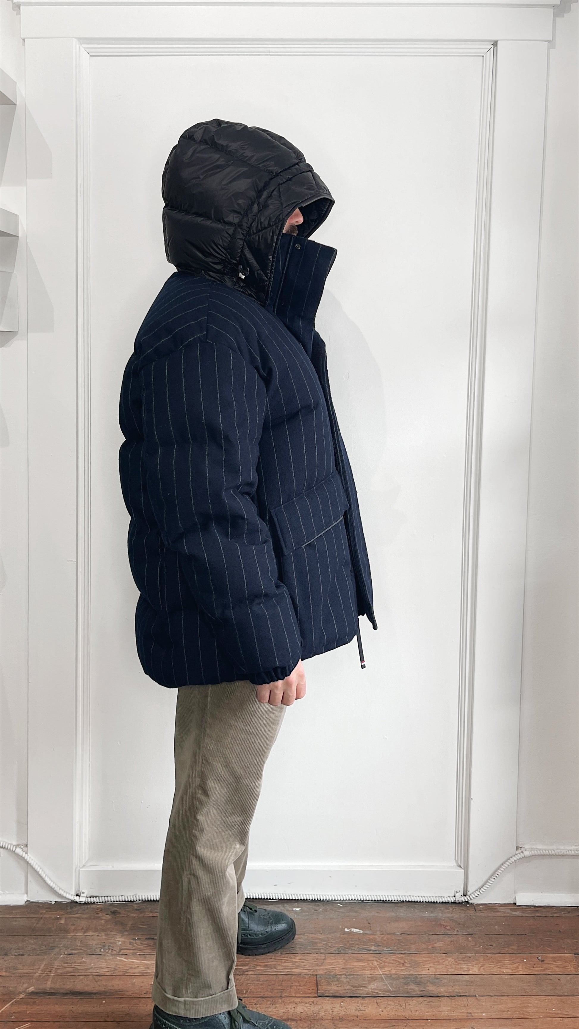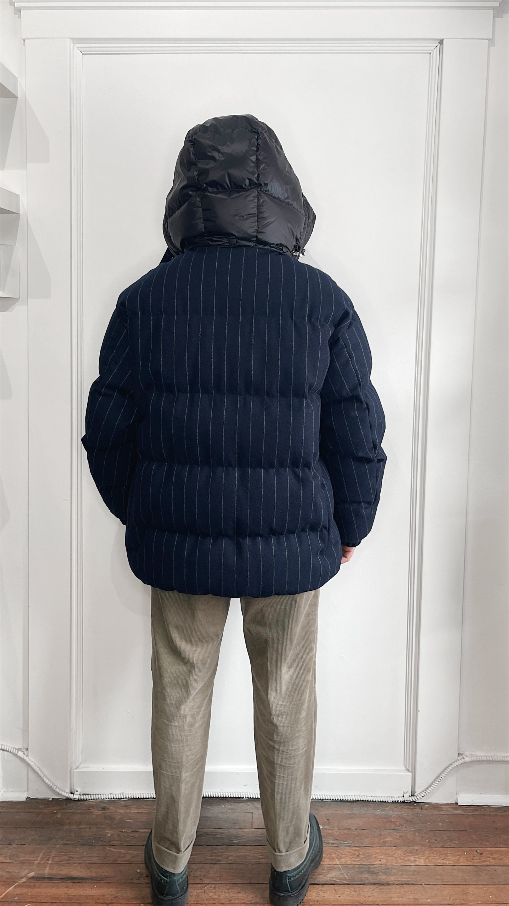 Item: Moncler Grenoble Navy Blue & White Pinstriped Wool Down Filled Gressan Jacket Size 4