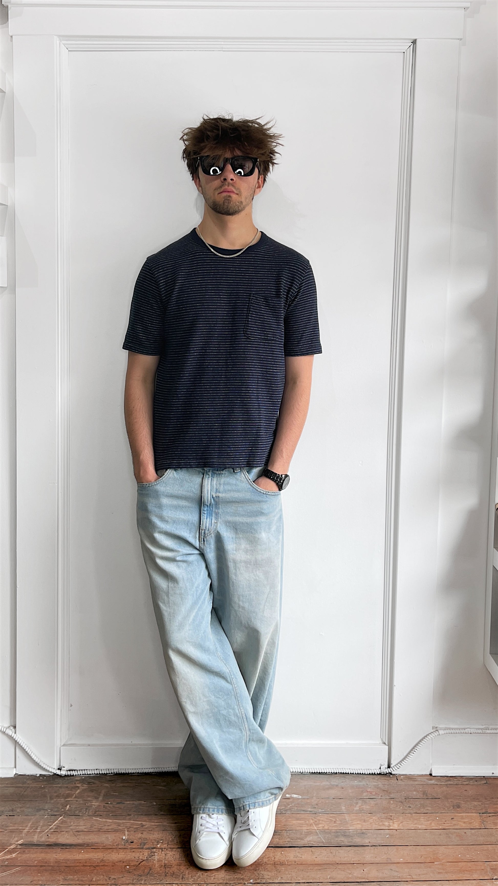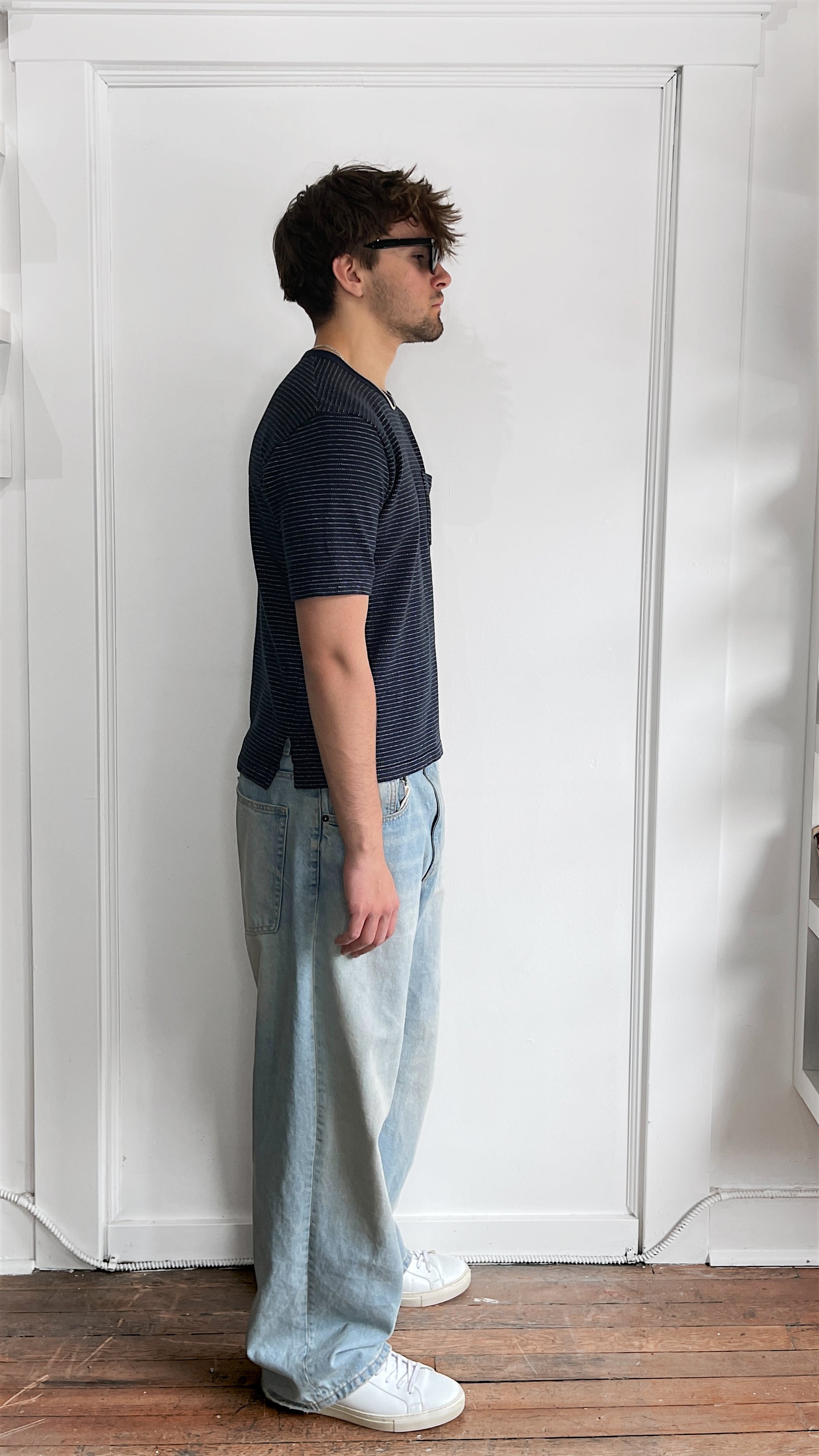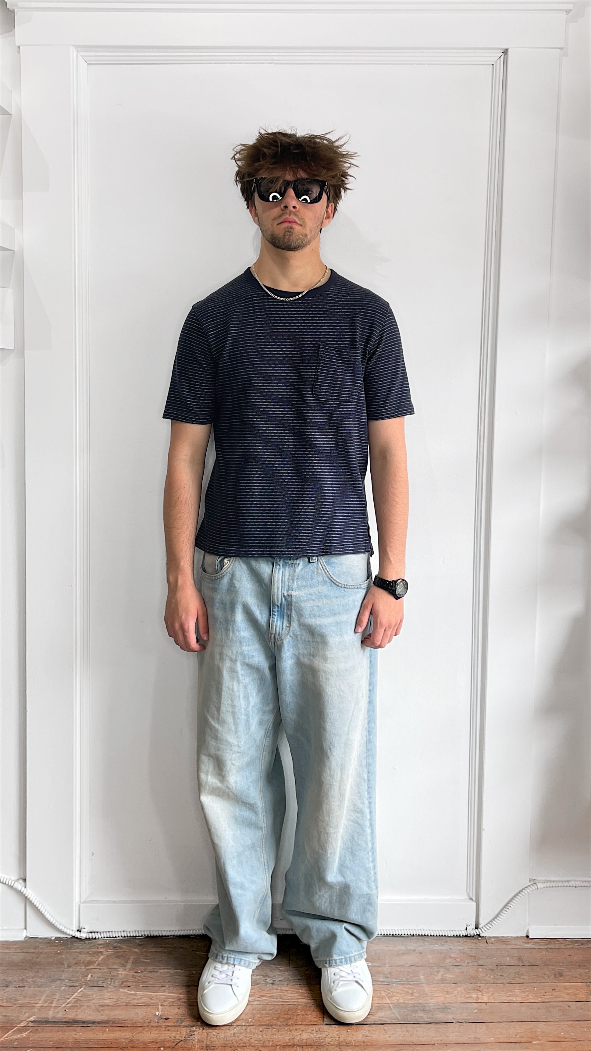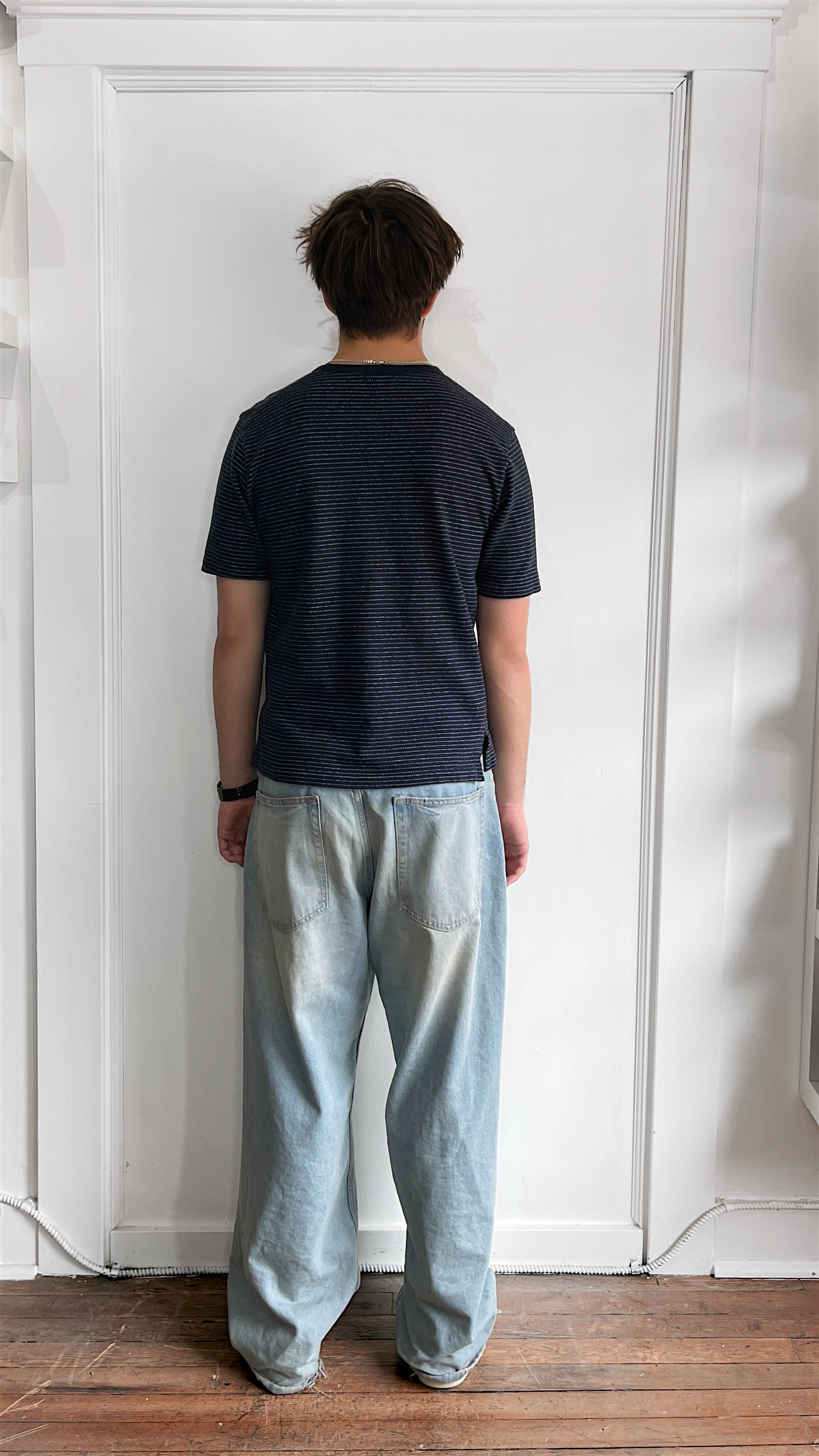 Nanamica Navy Blue & White Birdseye Stripe T-Shirt Medium