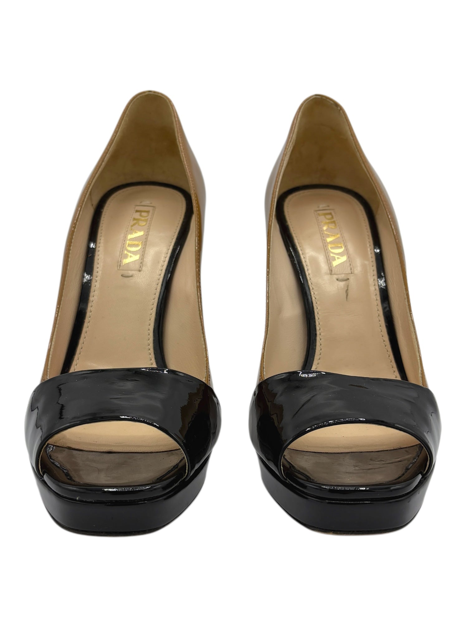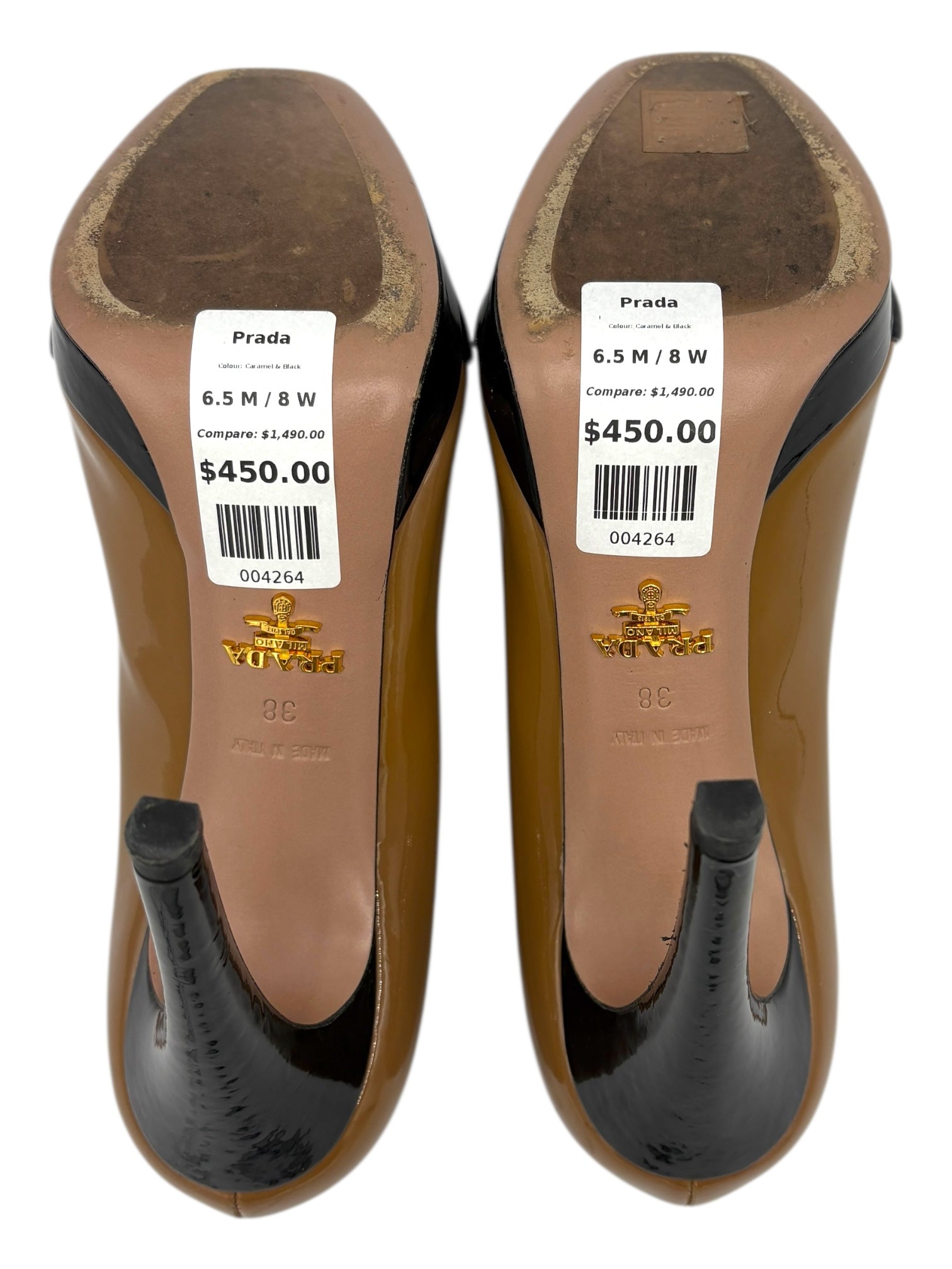 Prada Caramel & Black Patent Leather Square Toe Heels 6.5 M / 8 W
