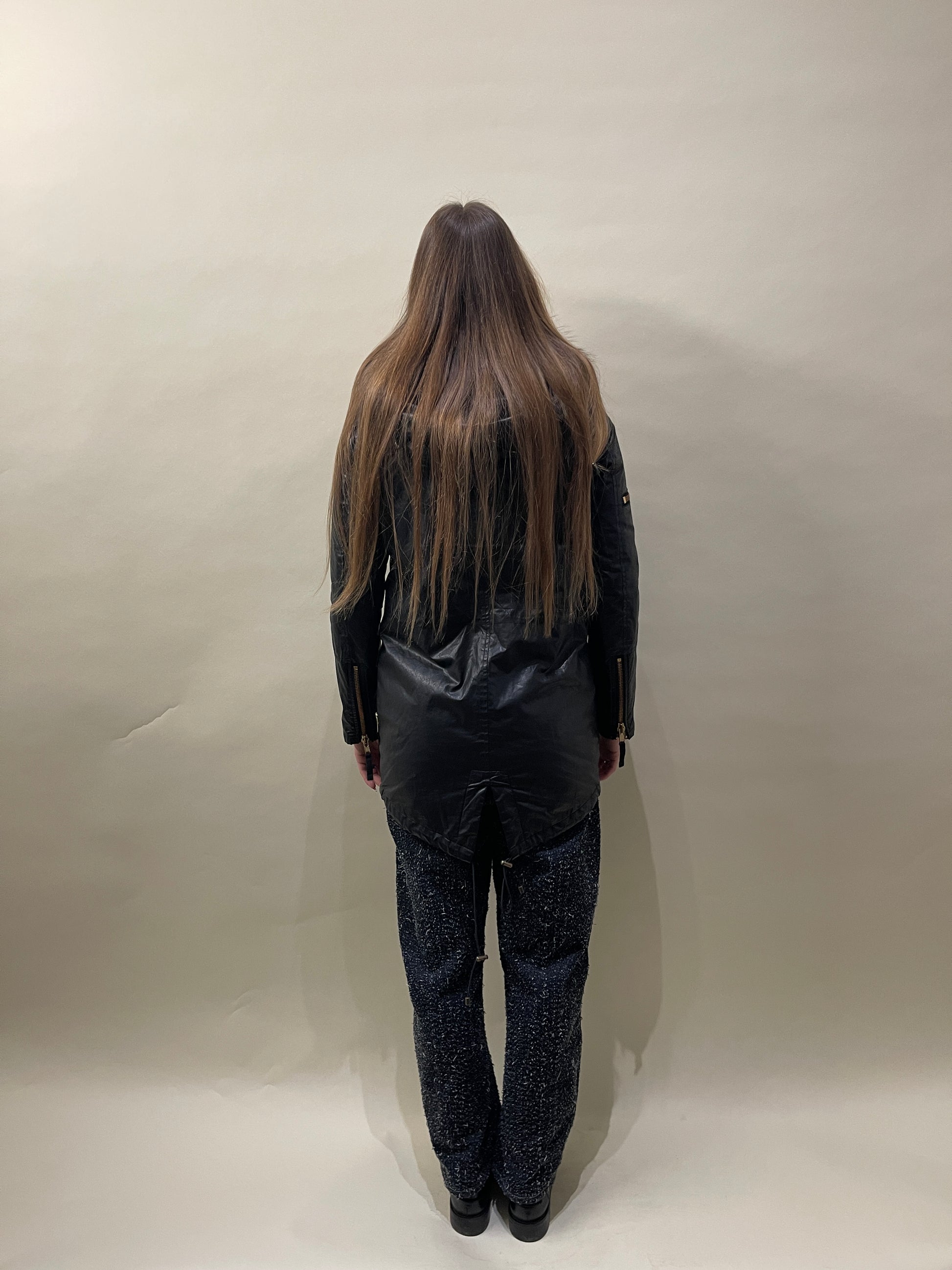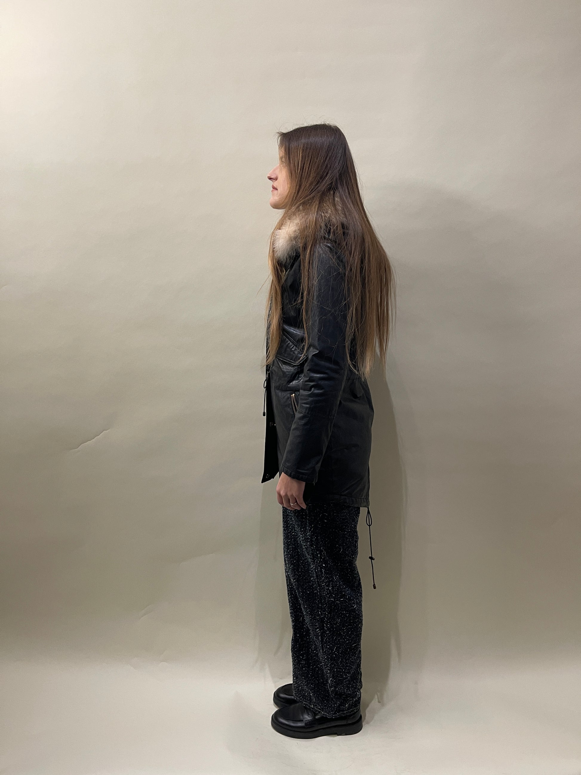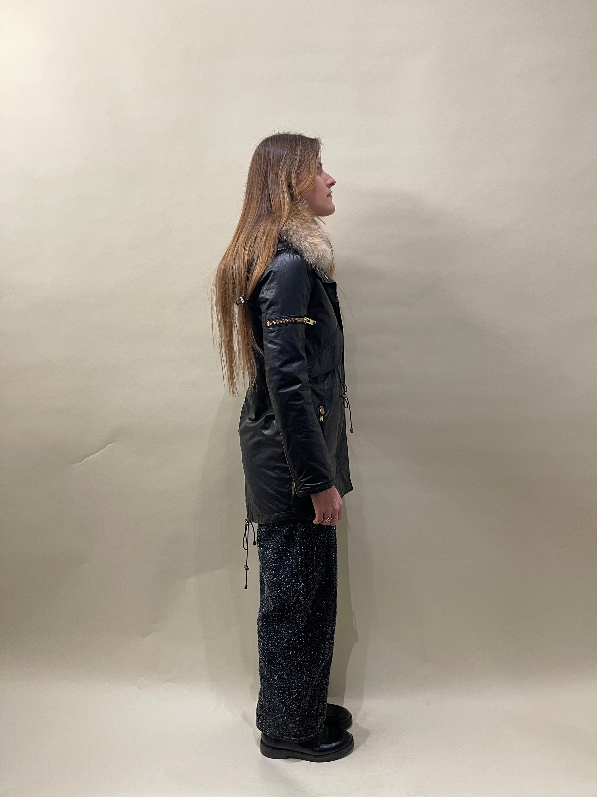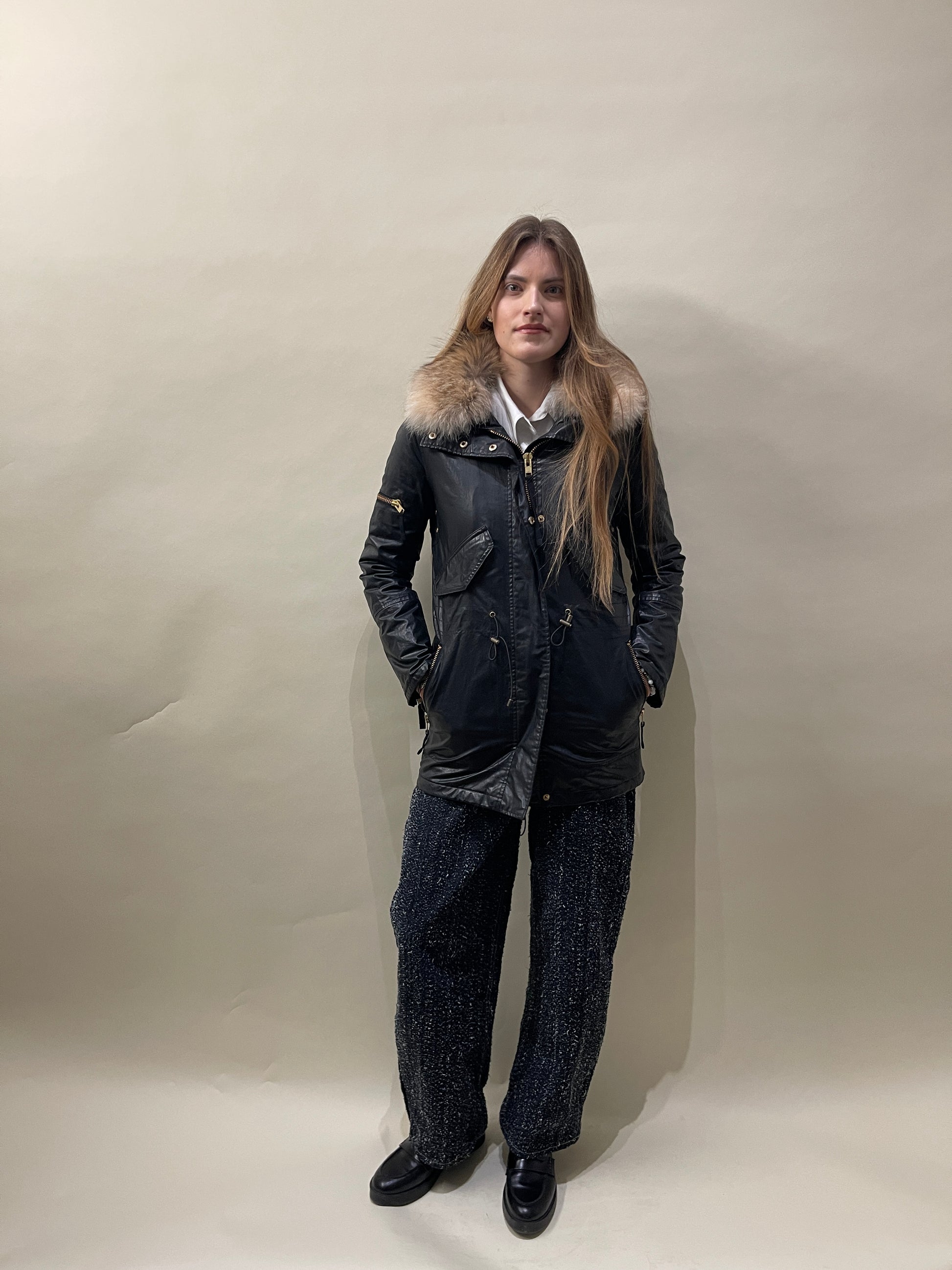 SAM. New York Black Cotton Blend Coyote Fur Hooded Fishtail Jacket XS - Made in China