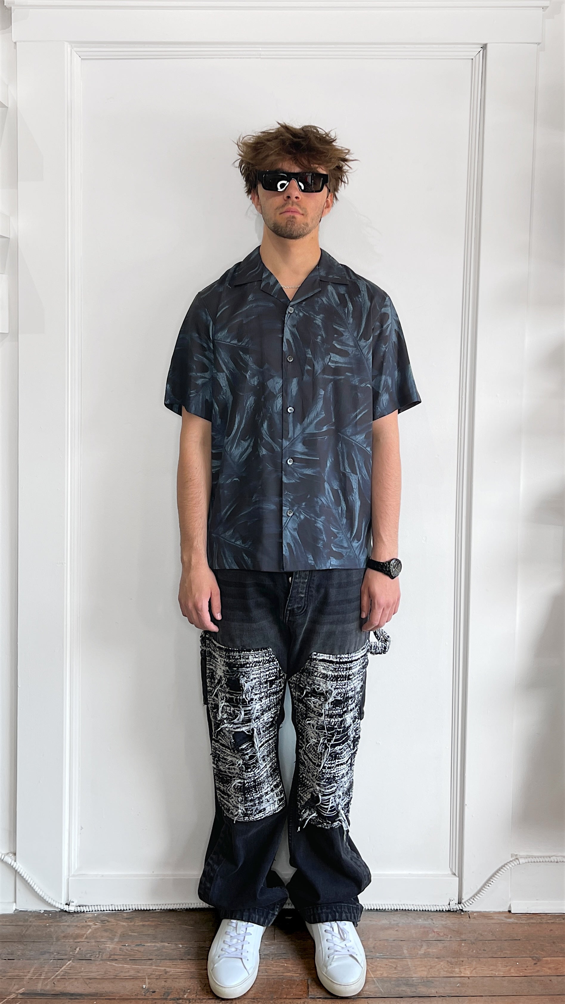 Item: Theory Dark Slate Blue Tonal Leaf Print Lyocell Camp Shirt Medium