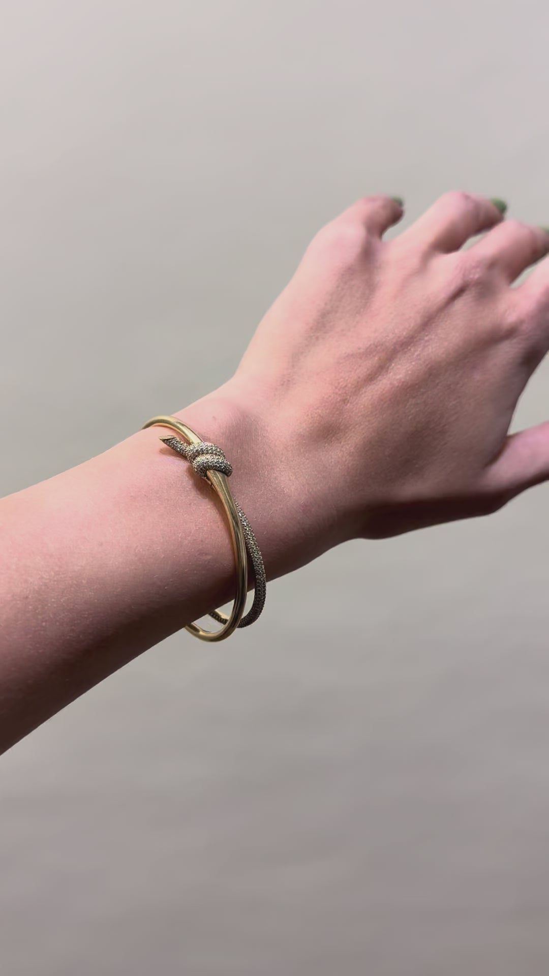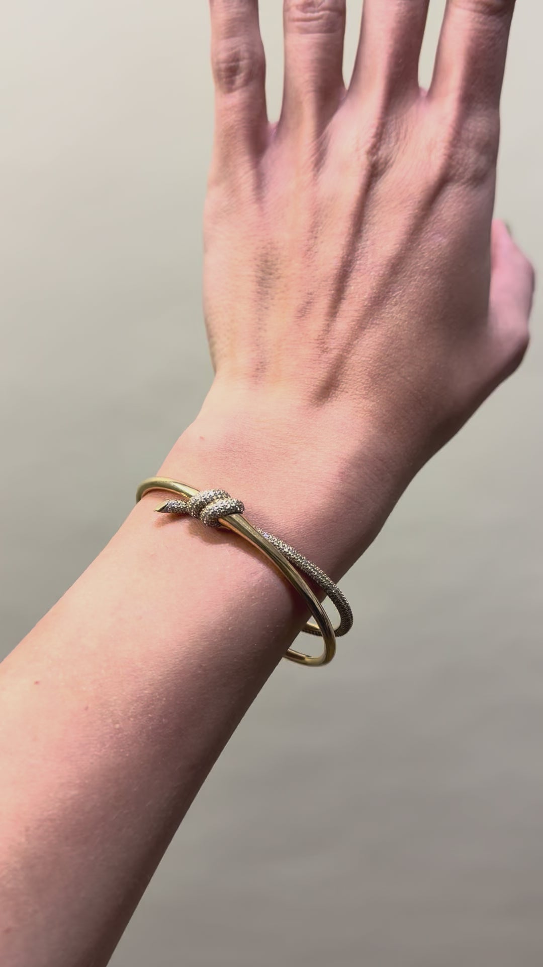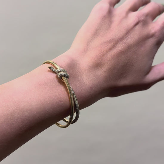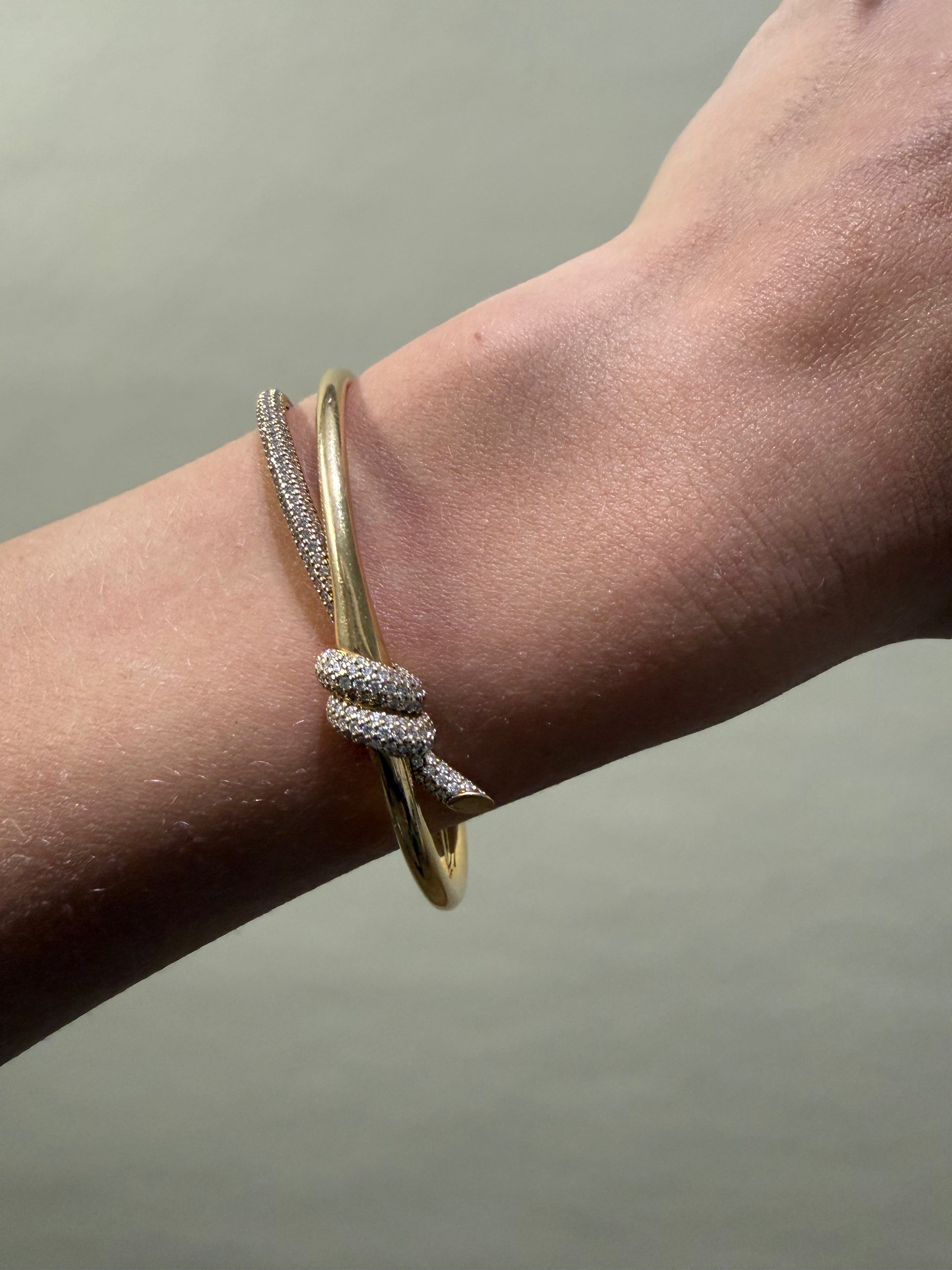 Tiffany Knot is an expression of love’s unwavering bonds. Inspired by an archival bow crafted in 1889, Knot is a symbol of life’s most enduring ties and meaningful connections. This bangle is crafted with yellow gold and pavé diamonds, then polished by hand for high shine. Each round brilliant diamond, specifically chosen to meet Tiffany’s high standards, is hand set at precise angles to maximize brilliance. Wear this bangle on its own or partnered with classic silhouettes for an unexpected pairing.