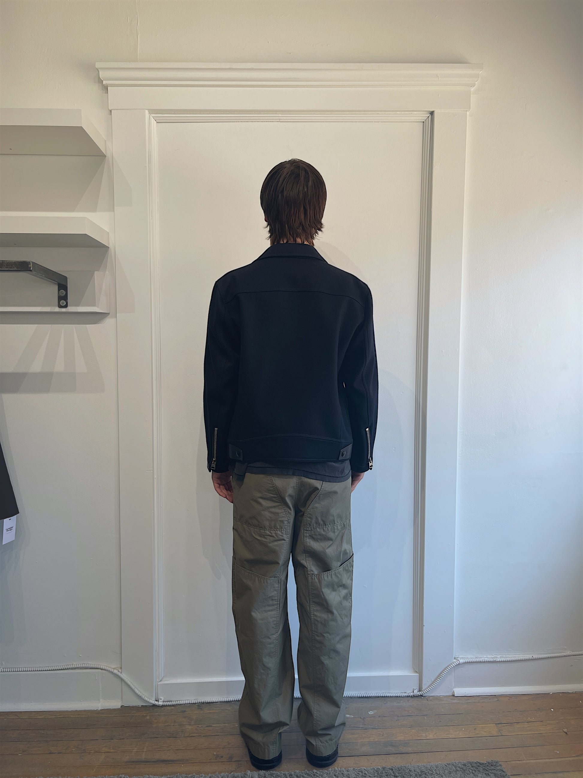 Item: Tom Ford Navy Blue Wool Collared Jacket W/ Zip & Button Closure & Leather Trim On Collar & Cuffs 40