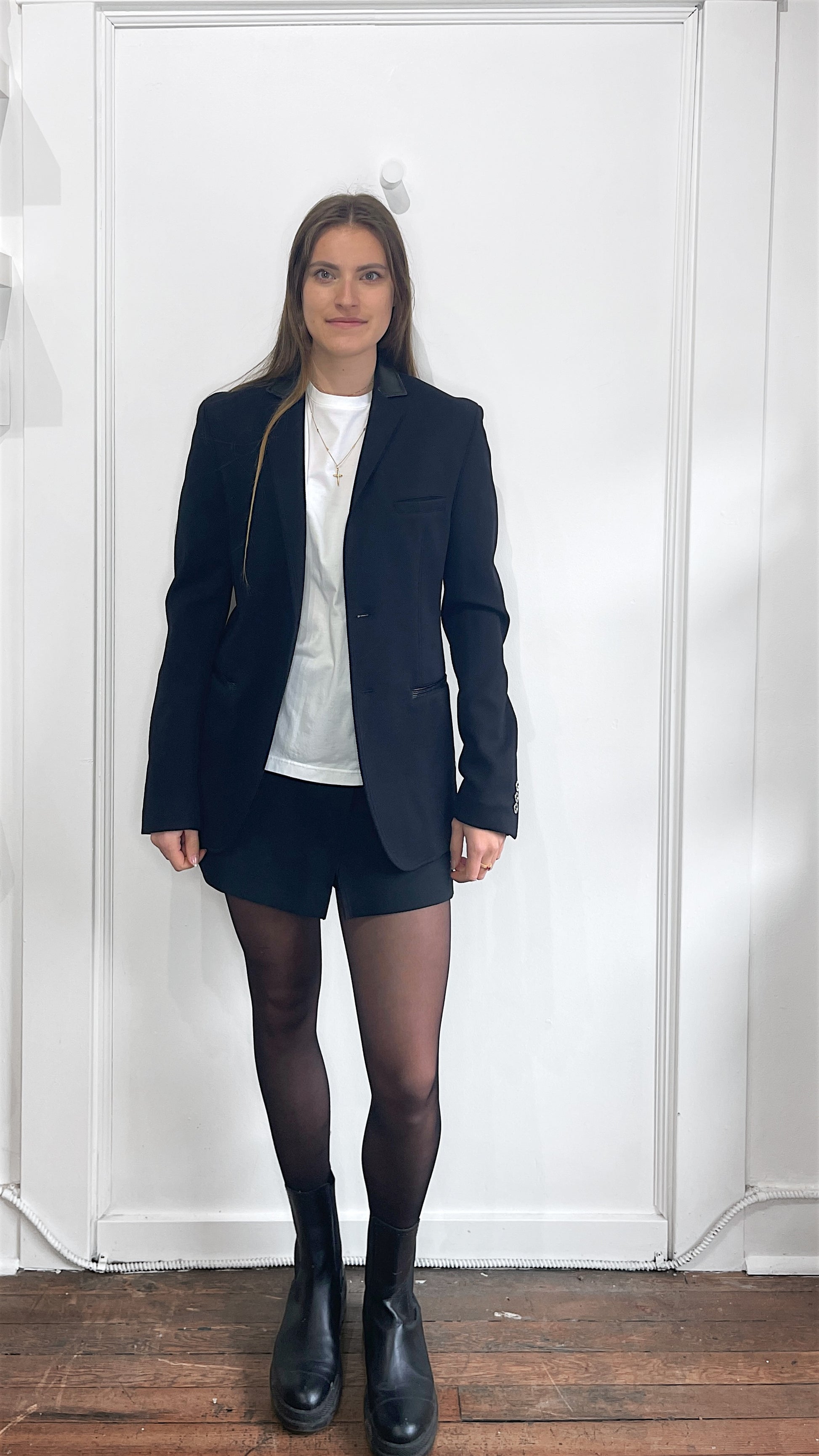 Item: Versace Black Polyamide Sport Coat W/ Silver Buttons & Leather Detailing 36
