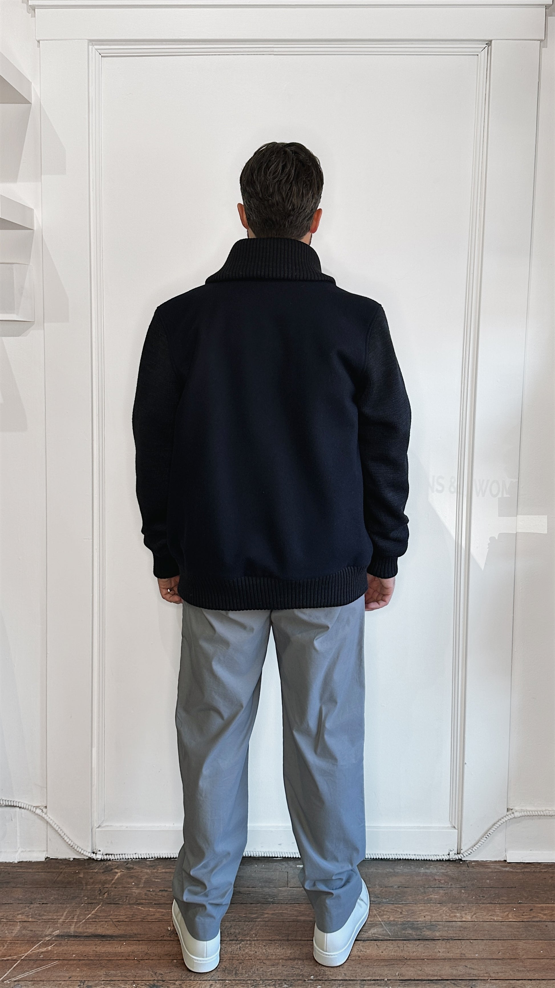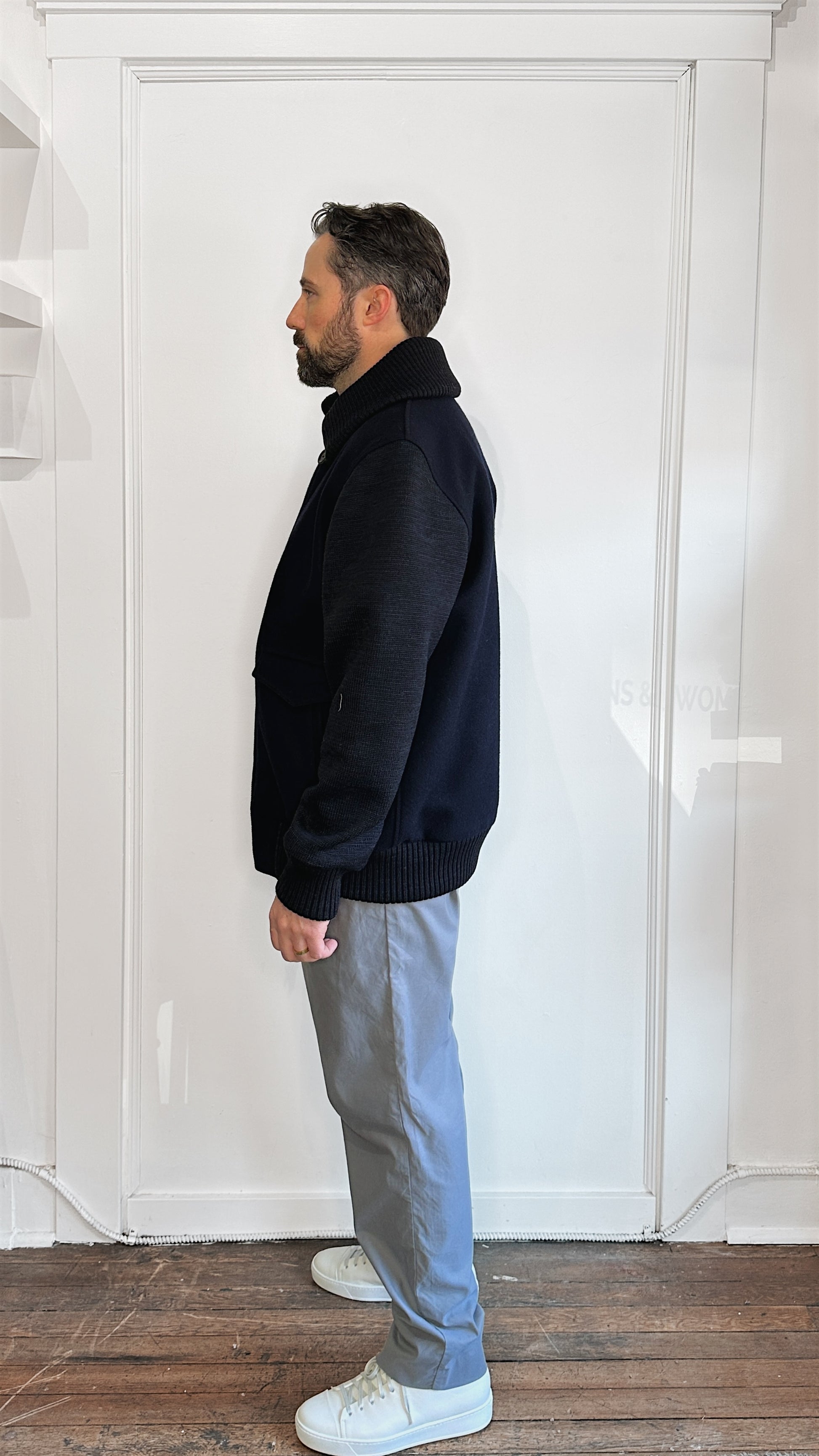 Item: Wings + Horns Multi Navy Blue Wool Bomber Jacket W/ Melton Wool Body & Knit Wool Sleeves / Collar Extra Large